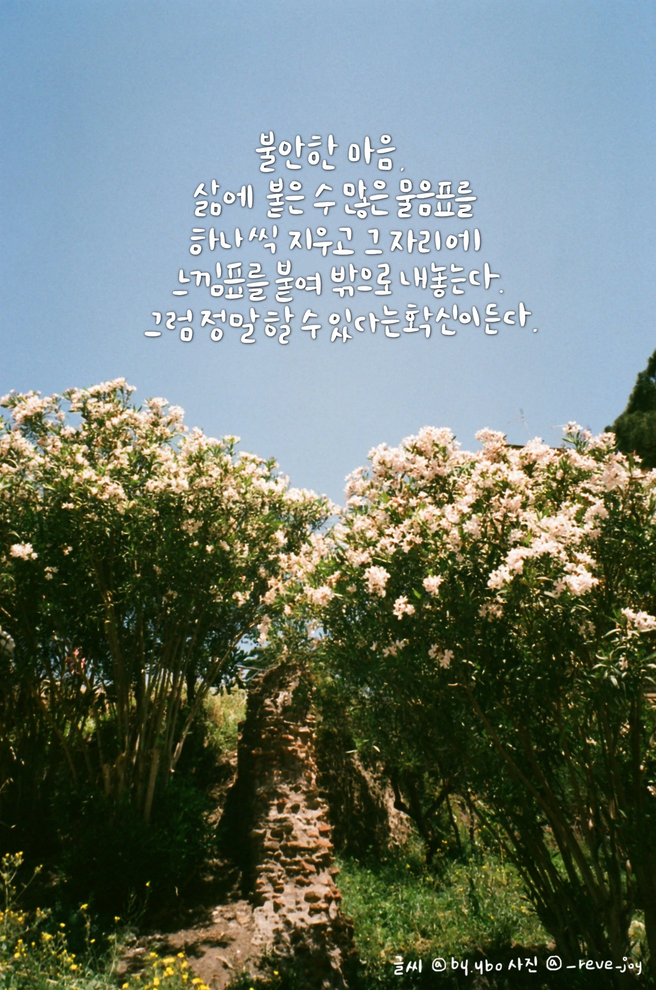 지금도 엄마는 내가 무슨 일을 한다는 계획을 말하면 다른 말보다 "넌 할 수 있어. 할 수 있다! 해봐"라고 한다. 예전에는 오글거려하지 못했는데 요새는 엄마를 따라 "할 수 있다!" 소리를 통해 입 밖으로 내놓는다. 불안한 마음, 삶에 붙인 수많은 물음표를 하나씩 지우고 그 자리에 느낌표를 붙여 밖으로 내놓는다. 그럼 정말 할 수 있다는 확신이 든다.