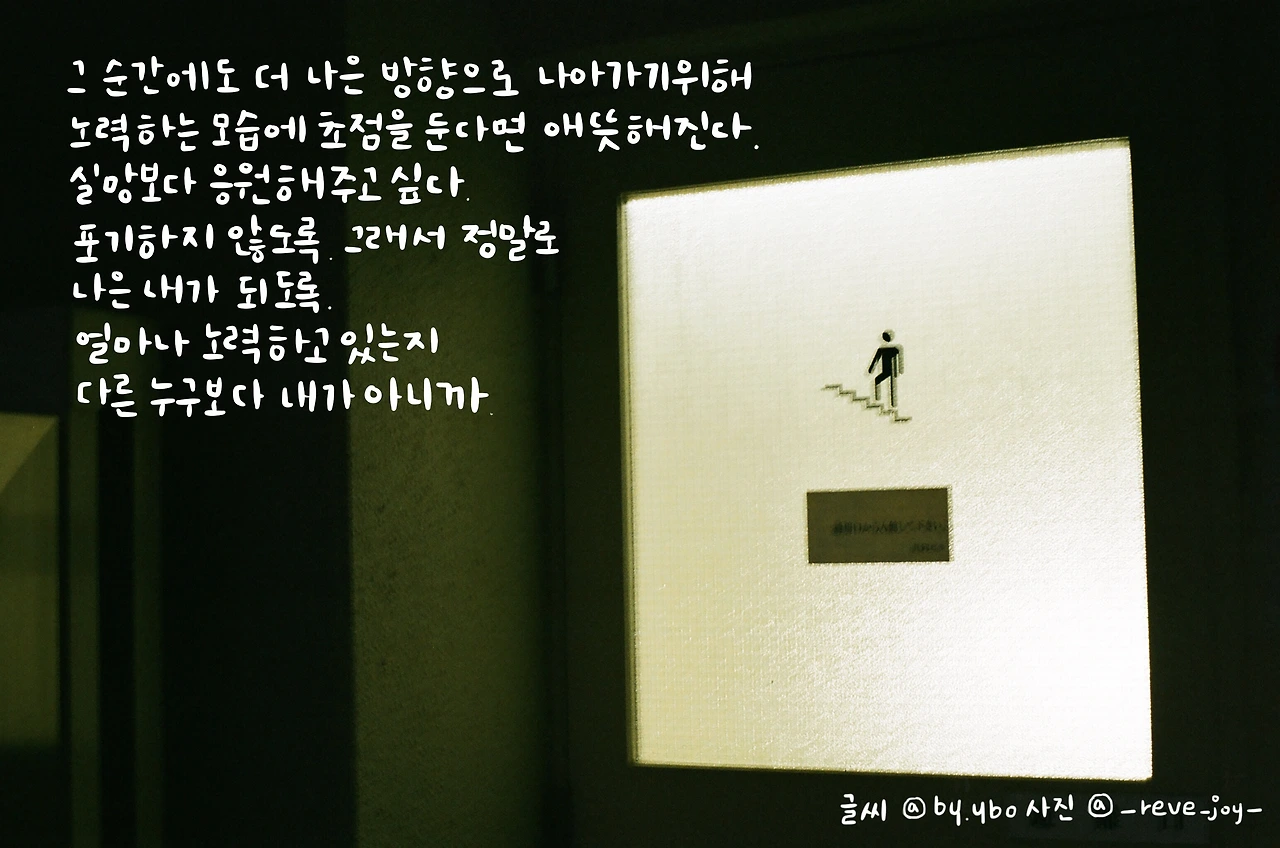 실수투성에 불안전한 모습을 보면 누구라도 사랑하긴 힘들 것이다. 하지만 그 순간에도 더 나은 방향으로 나아가기 위해 노력하는 모습에 초점을 둔다면 애틋해진다. 실망보다 응원해주고 싶다. 포기하지 않도록. 그래서 정말 나은 내가 될 수 있도록. 얼마나 노력하고 있는지 다른 누구보다 내가 아니까.