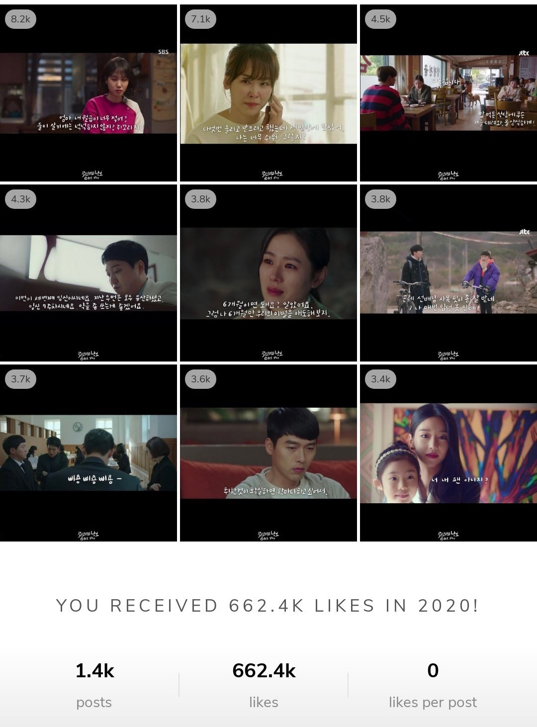 작년과 올해를 비교하기 위해 대사를 올린 피드를 살펴보면서 또 하나의 차이점을 발견했다. 작년에는 게시글 당 좋아요 수가 높았다면, 올해 게시글들은 댓글 수가 상대적으로 높았다. 얼마만큼 동의할지 모르겠으나, 개인적으로 작년에는 사람의 마음이 하나로 모아지는 작품들이 있었다. 눈이 부시게, 멜로가 체질, 검색어를 입력하세요 www, 동백꽃 필 무렵 등의 작품은 모두에게 인상 깊게 남았다. 해당 대사 게시물들은 기본 500개 이상의 좋아요를 받았던 것을 보면 많은 이들이 이 작품들을 보았던 게 아닌가 생각해 볼 수 있다.