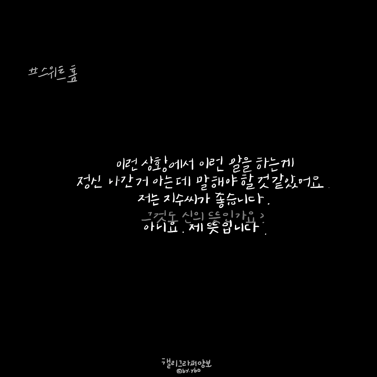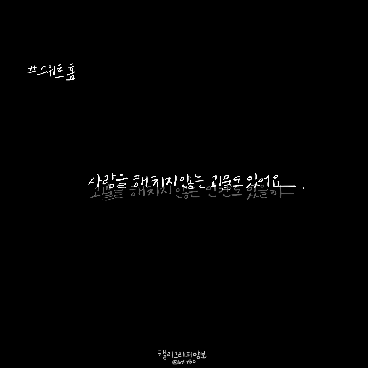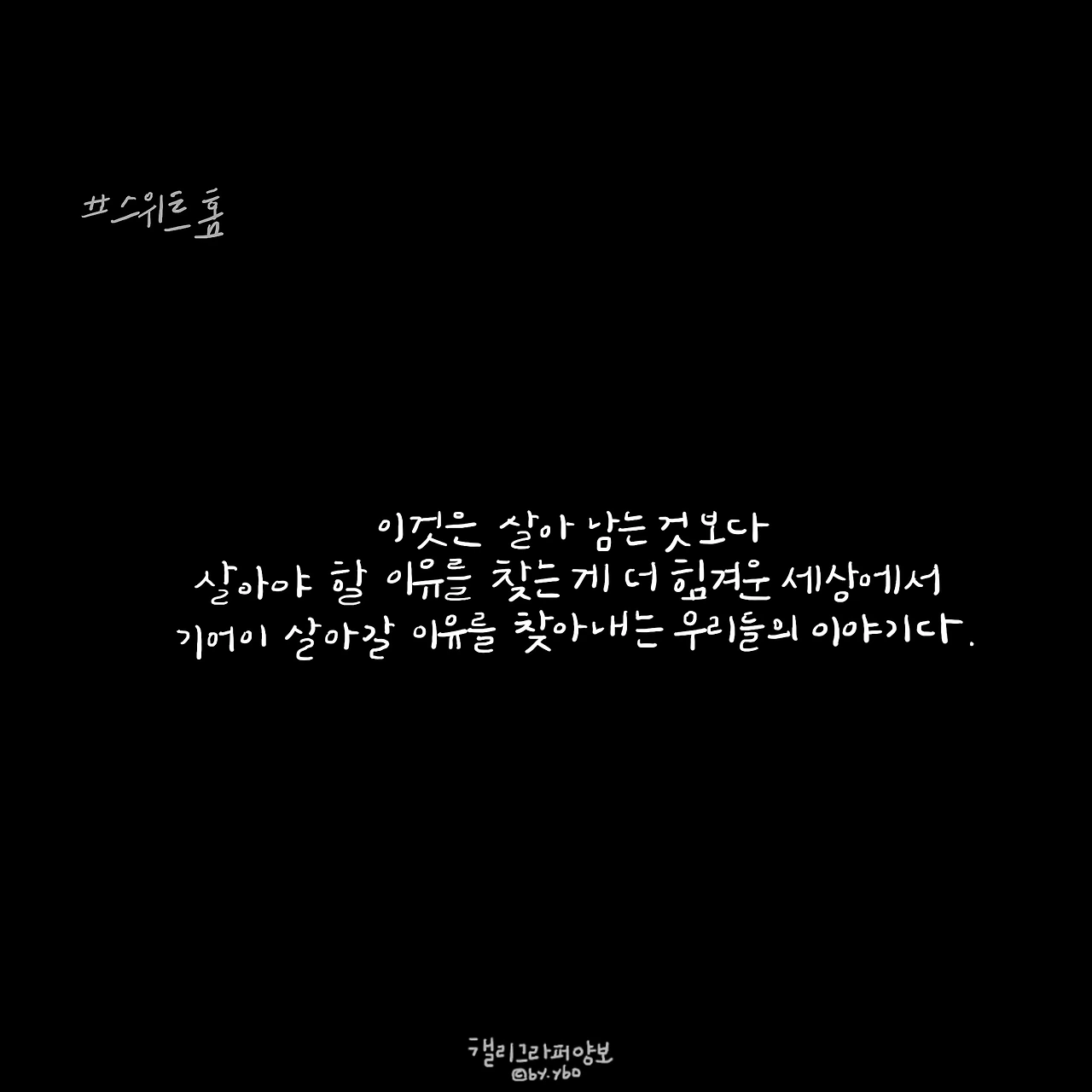 갑자기 사람들이 하나둘씩 괴물로 변해가기 시작했다. 정부의 발표에 따르면 공기나 접촉을 통해 옮는 건 아니라고 했다. 인간의 욕망이 만들어 낸 괴물이라고 했다. 좀비와 다르다. 어떻게 해도 죽지 않는다는 건 좀비와 비슷하지만 괴물에게 물린다고 괴물 화가 되는 건 아니었다. 인간으로 잘 있다가도 갑자기 엄청난 양의 코피가 쏟아지고, 잠시 혼절을 하고 나면 괴물 화가 시작되었다. 전혀 스위트하지 않은 아파트 안에서 괴물과 사투를 벌이는 스,위트홈>을 보면서 인생에 갖고 있어야 할 중심에 대해 다시금 생각하게 됐다.