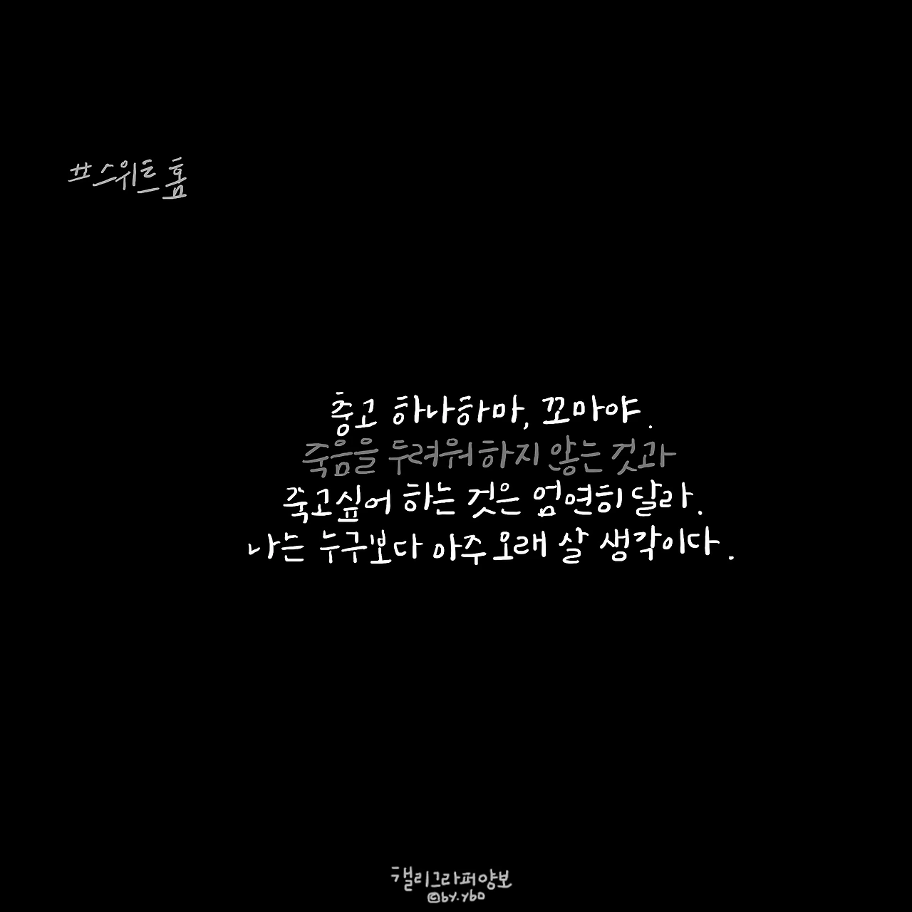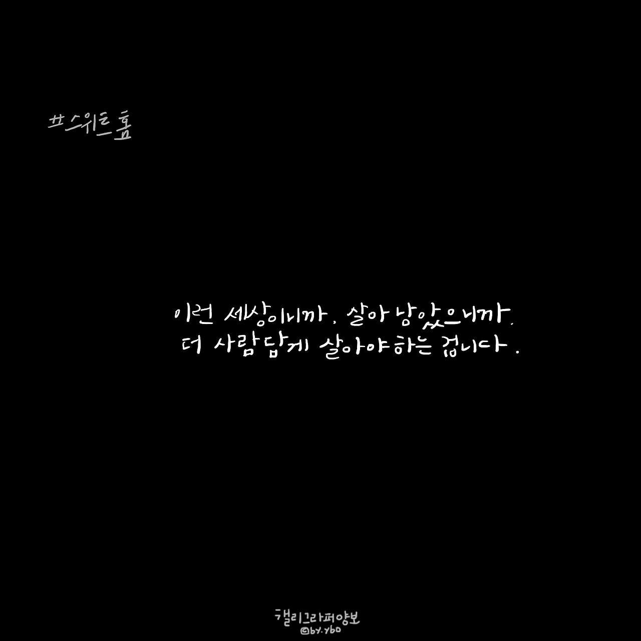 2021년에는 왜 사는지, 일마다 행동마다 질문을 던져보려 한다. 분주하기만 한 삶이 그래도 정리되지 않을까 싶다. 이기적인 욕심보다 이타적이었으면 한다. 스위트홈에 모인 이들 중에서 괴물 화가 적었던 건 개인적 욕망보다 서로를 위하는 마음이 있었기 때문이었다는 생각하기에. 깊은 어둠도 흐린 빛에 사라진다고 한 그 말을 기억하며, 마음 속에 빛을 지켜낼 수 있길 바라본다.