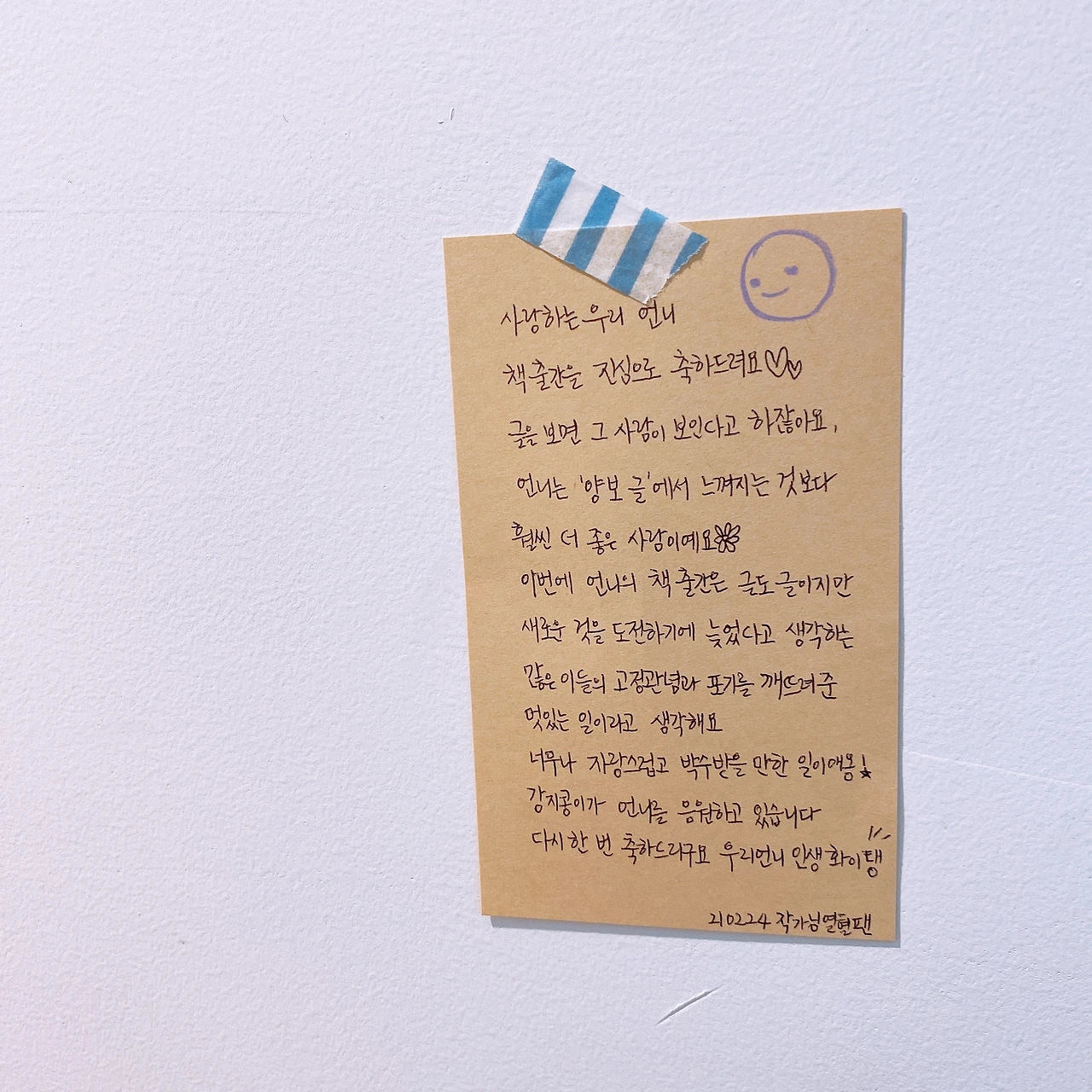 그녀의 카드를 몇 번 더 읽었다. ‘새로운 것을 도전하기에 늦었다고 생각하는 많은 이들의 고정관념과 포기를 깨트려 준 멋있는 일’. 아무리 생각해도 고작 책 한 권 냈다고 받기엔 너무나 거창한 말이다. 하지만 내가 얼마나 많은 걱정과 염려를 했는지, 얼마나 자주 자신을 의심했는지, 겁을 먹었는지 가까이에 있던 그녀는 알고 있었다. 어쩌면 책을 출간하기 마음먹었던 그때부터 이 날까지의 시간은 두려움과 그만두고 싶은 마음, 자신을 의심하던 생각과 싸운 시간일지 모른다. 왜 책을 내고 싶어하는 걸까, 출간의 의미를 계속 생각했는데 용기에 관한 일이었구나 싶고. 고작 책 한 권 써낸 일에 붙이기에 너무 거창한 생각들일까?