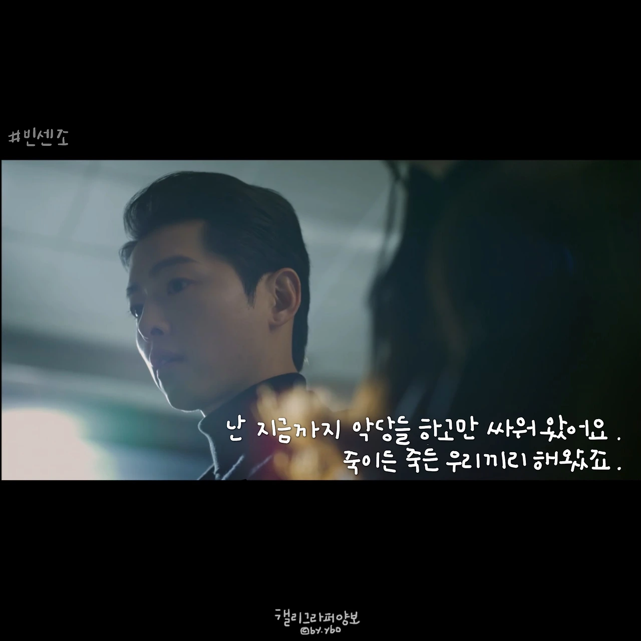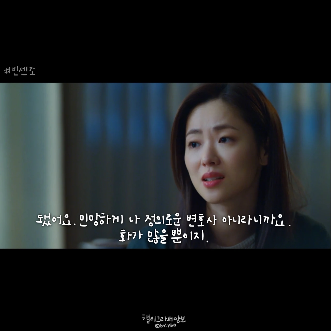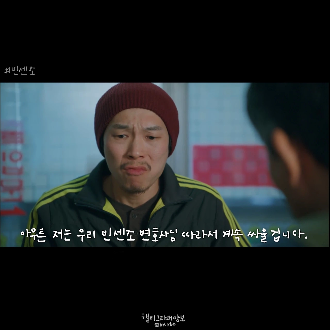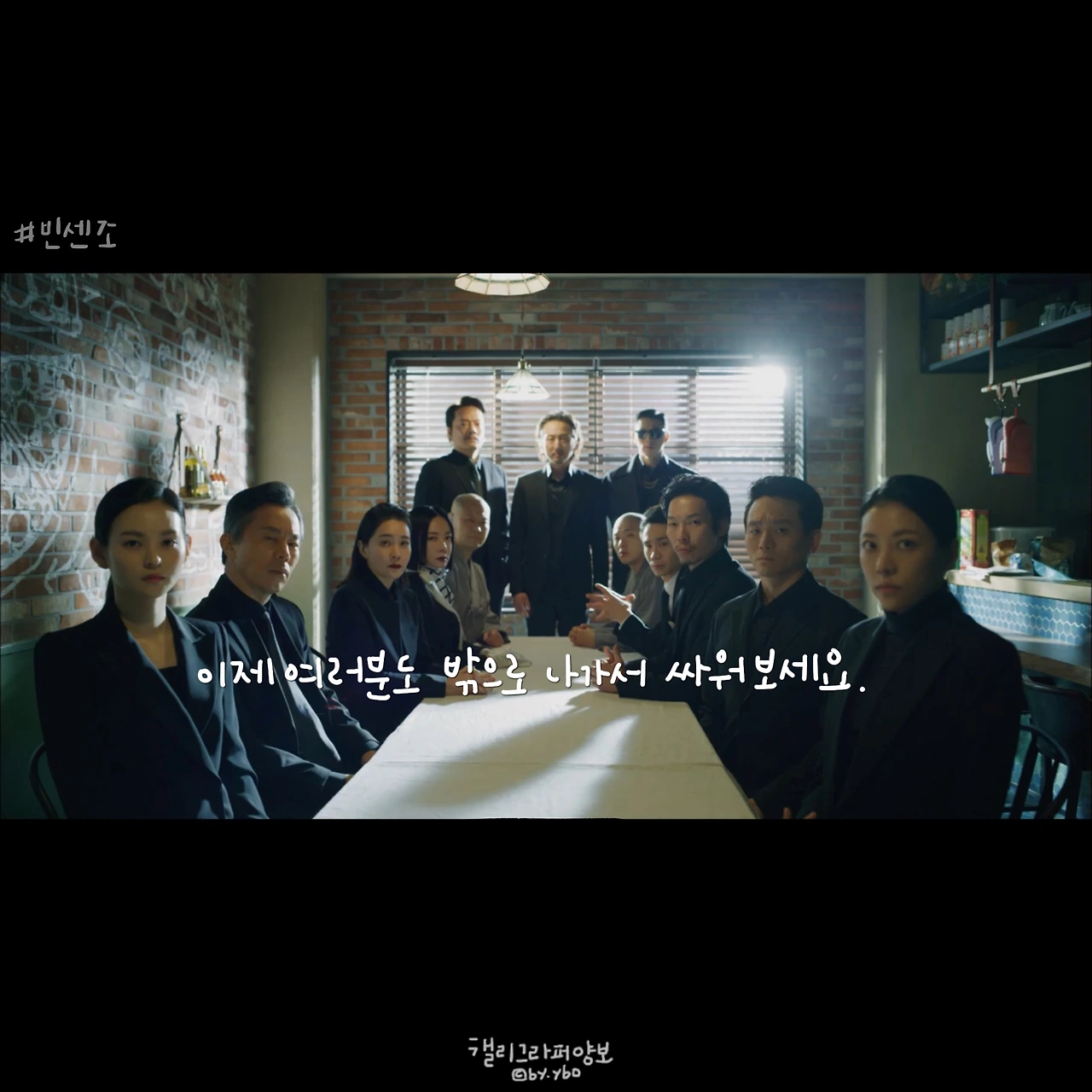 대사를 쓰면서 발견한 반응인데 1회를 보고 예상과 다른 분위기?에 포기 선언을 한 분들이 많은 듯하다. 하나 거기서 포기하면 좀 아쉽다. 억울할 수도 있다. 이 멋진 드라마를 못 보는건 손해니까. 좀 어색하거나 과하다 느껴지는 부분을 10초씩 살짝 뛰어넘어 조금만 더 가면 완전히 다른 분위기를 풍기는 <빈센조>를 만날 수 있으니까 부디 <빈센조> 미친 매력을 안 보는 일은 없길.