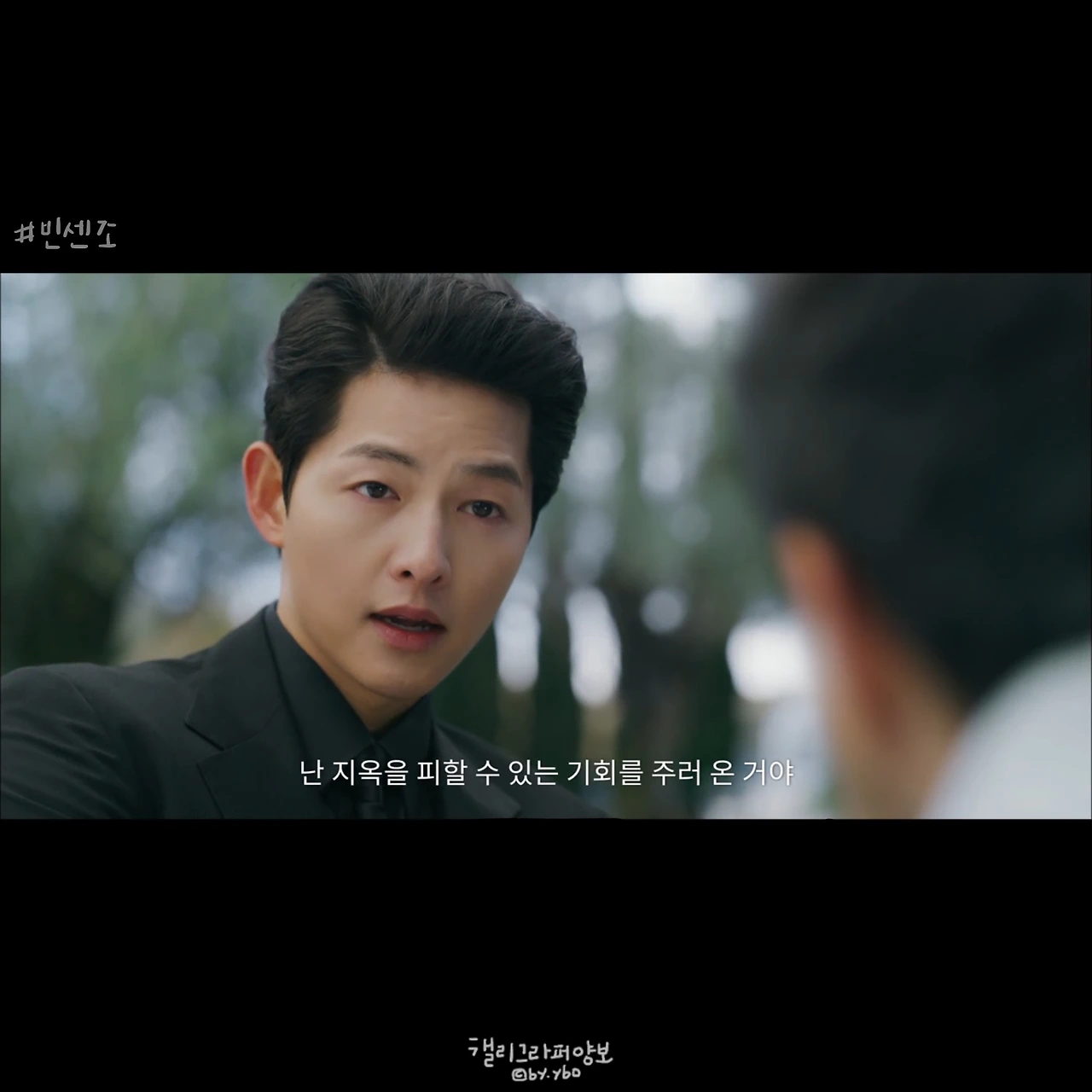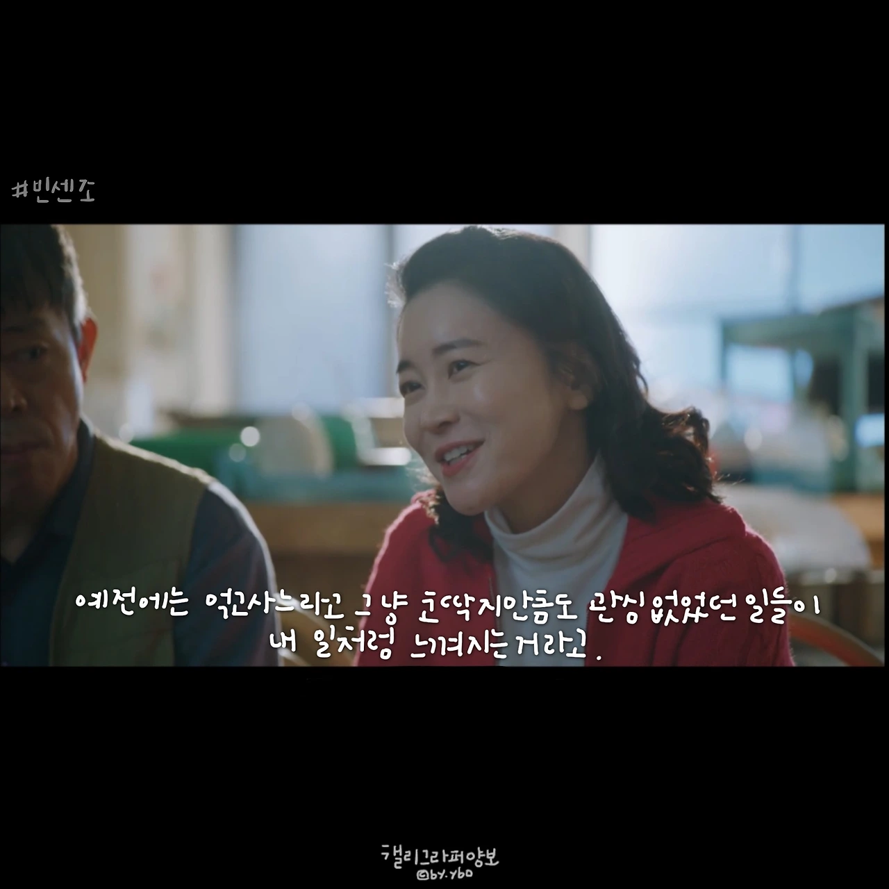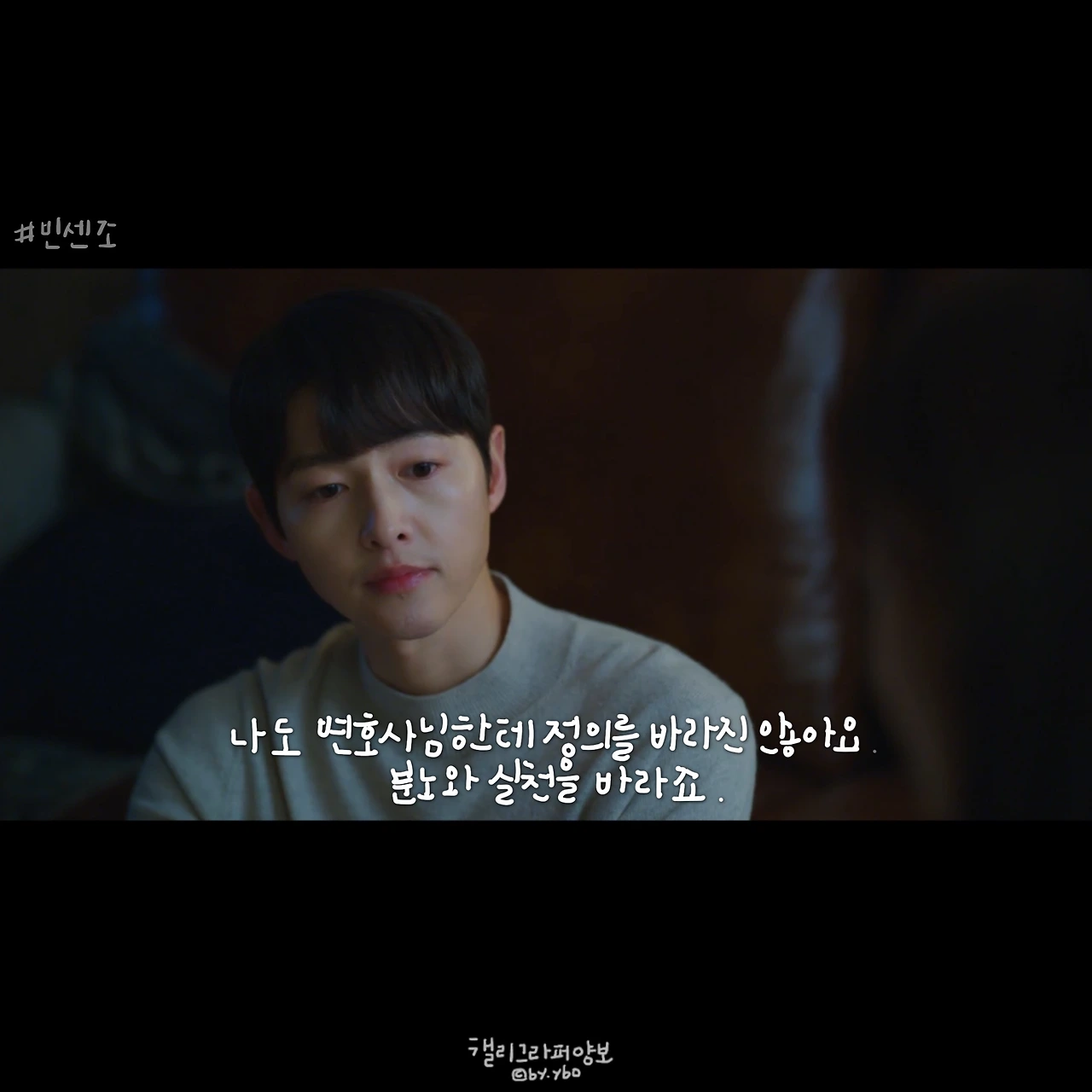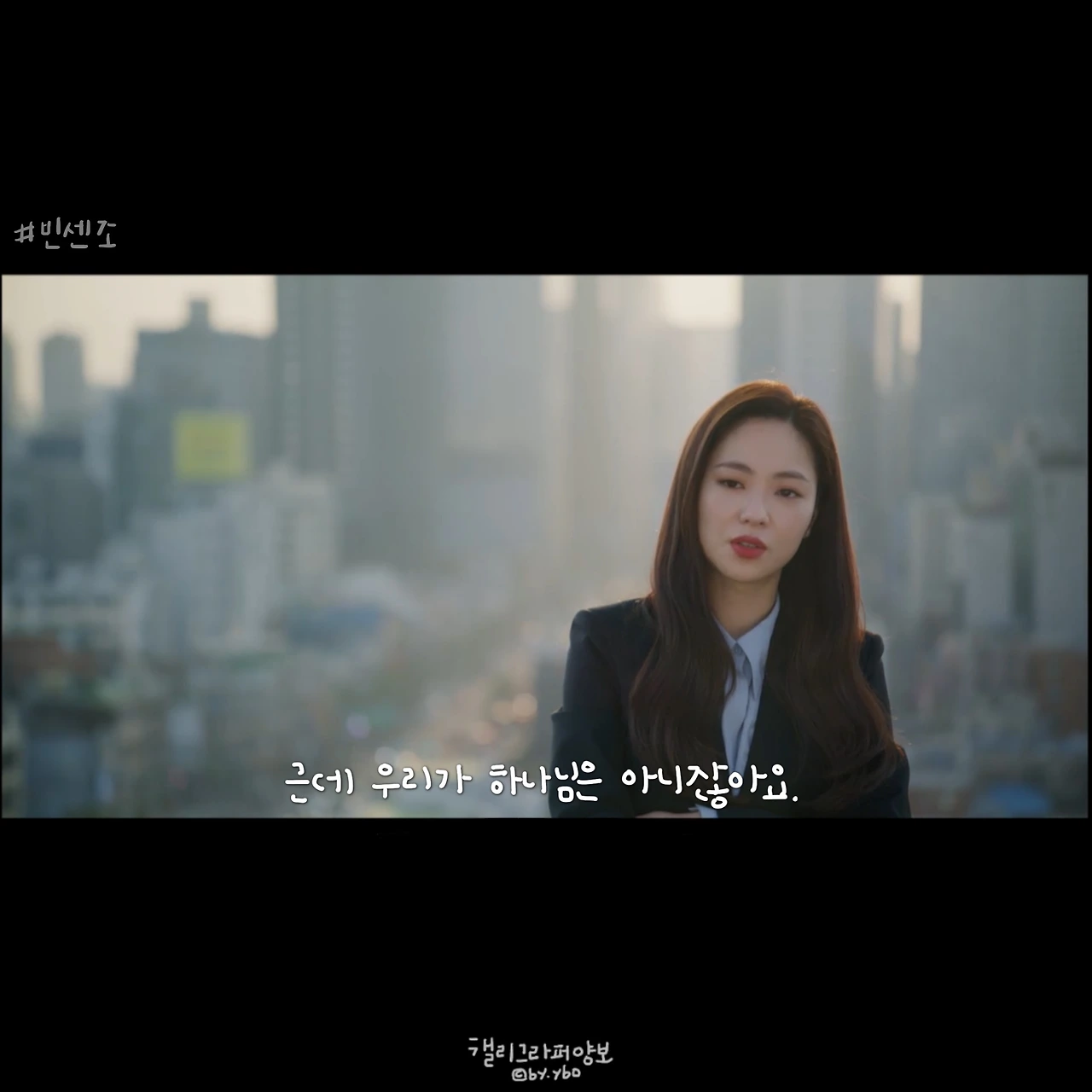대사를 쓰면서 발견한 반응인데 1회를 보고 예상과 다른 분위기?에 포기 선언을 한 분들이 많은 듯하다. 하나 거기서 포기하면 좀 아쉽다. 억울할 수도 있다. 이 멋진 드라마를 못 보는건 손해니까. 좀 어색하거나 과하다 느껴지는 부분을 10초씩 살짝 뛰어넘어 조금만 더 가면 완전히 다른 분위기를 풍기는 <빈센조>를 만날 수 있으니까 부디 <빈센조> 미친 매력을 안 보는 일은 없길.