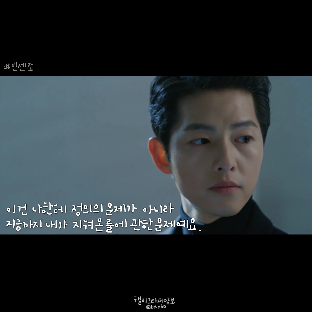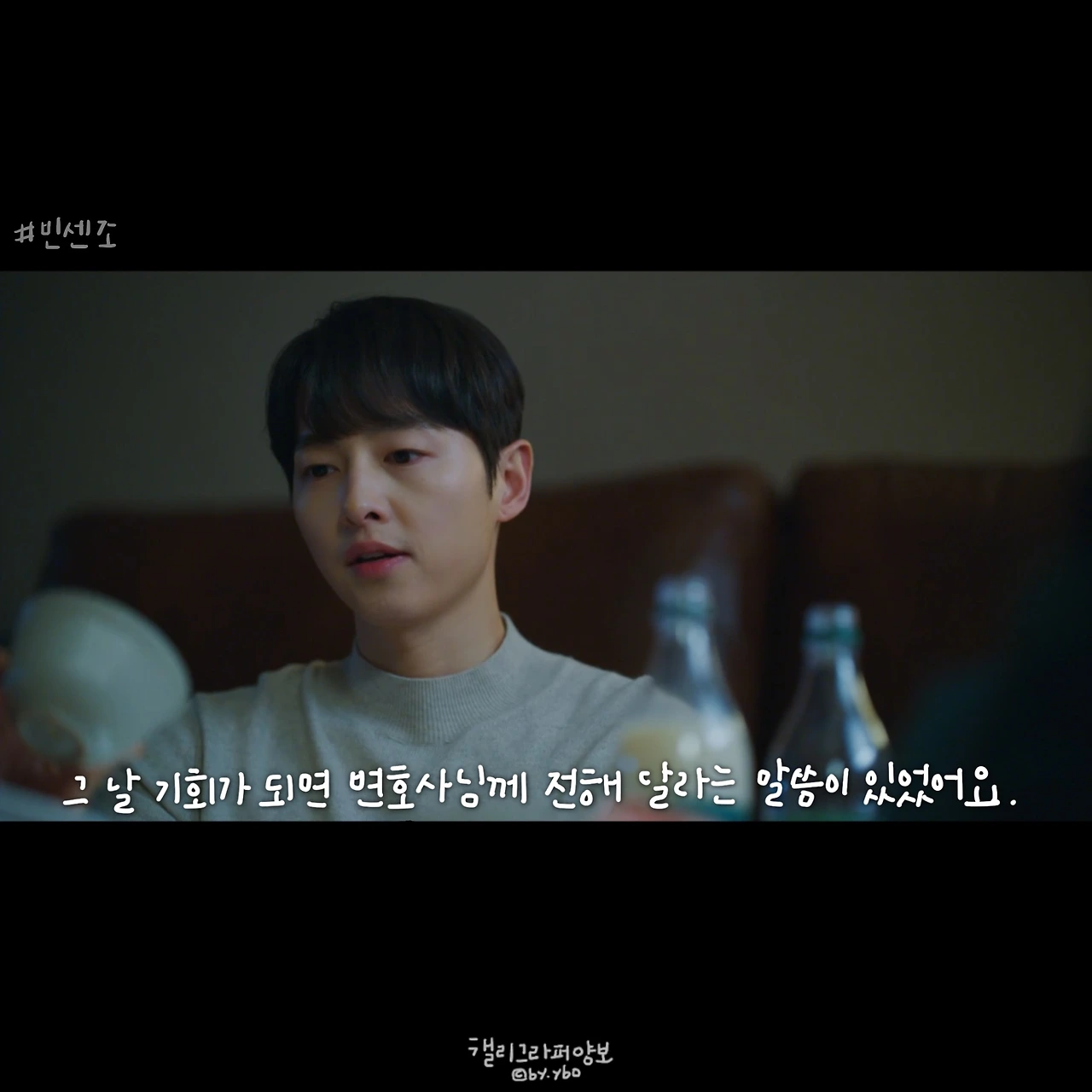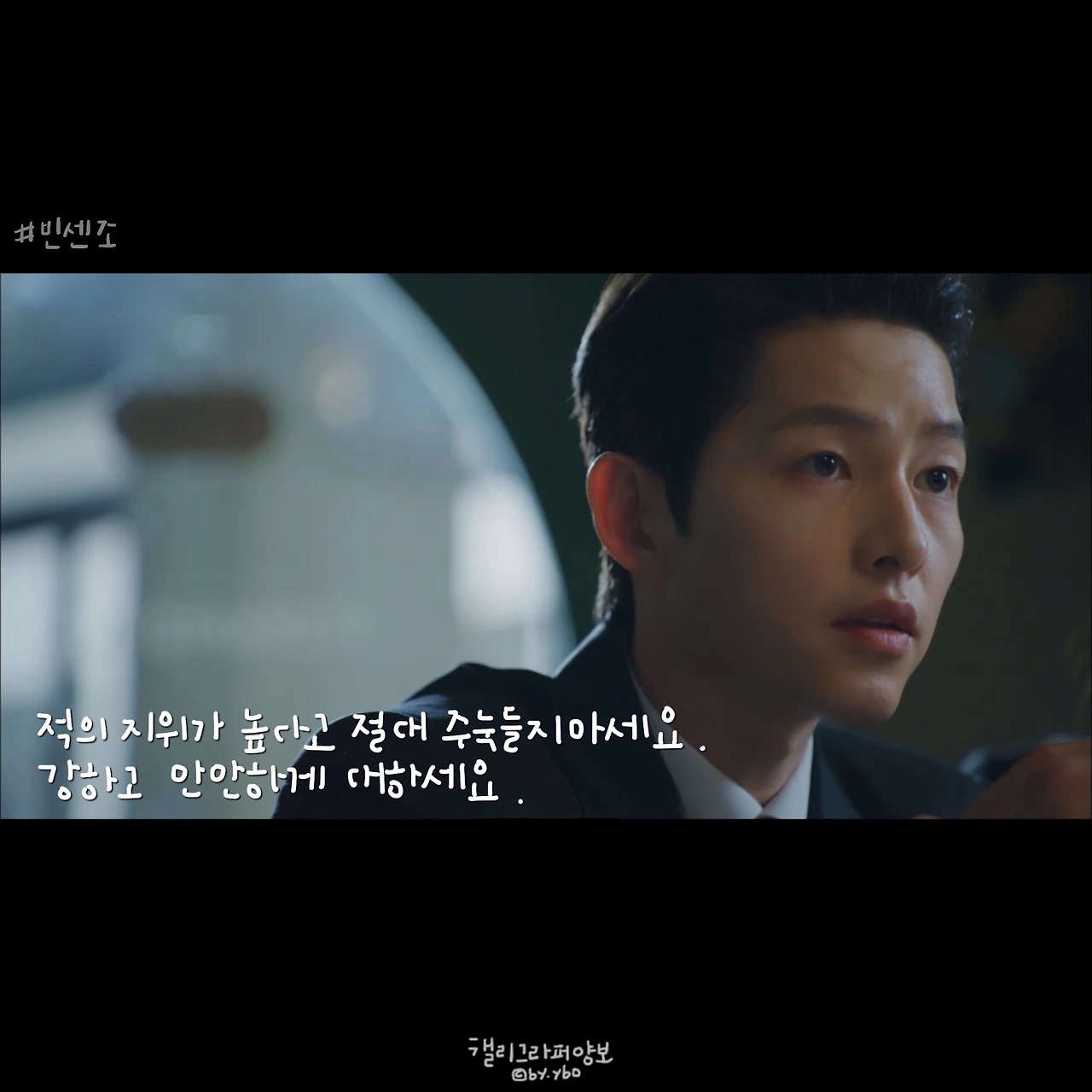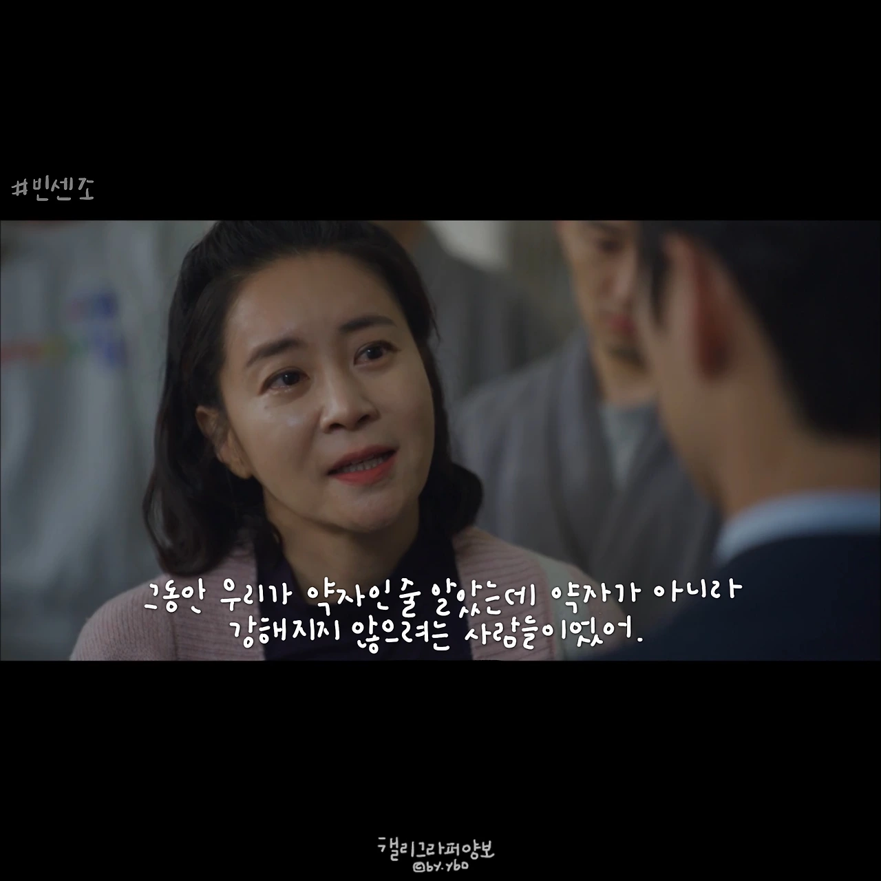 대사를 쓰면서 발견한 반응인데 1회를 보고 예상과 다른 분위기?에 포기 선언을 한 분들이 많은 듯하다. 하나 거기서 포기하면 좀 아쉽다. 억울할 수도 있다. 이 멋진 드라마를 못 보는건 손해니까. 좀 어색하거나 과하다 느껴지는 부분을 10초씩 살짝 뛰어넘어 조금만 더 가면 완전히 다른 분위기를 풍기는 <빈센조>를 만날 수 있으니까 부디 <빈센조> 미친 매력을 안 보는 일은 없길.