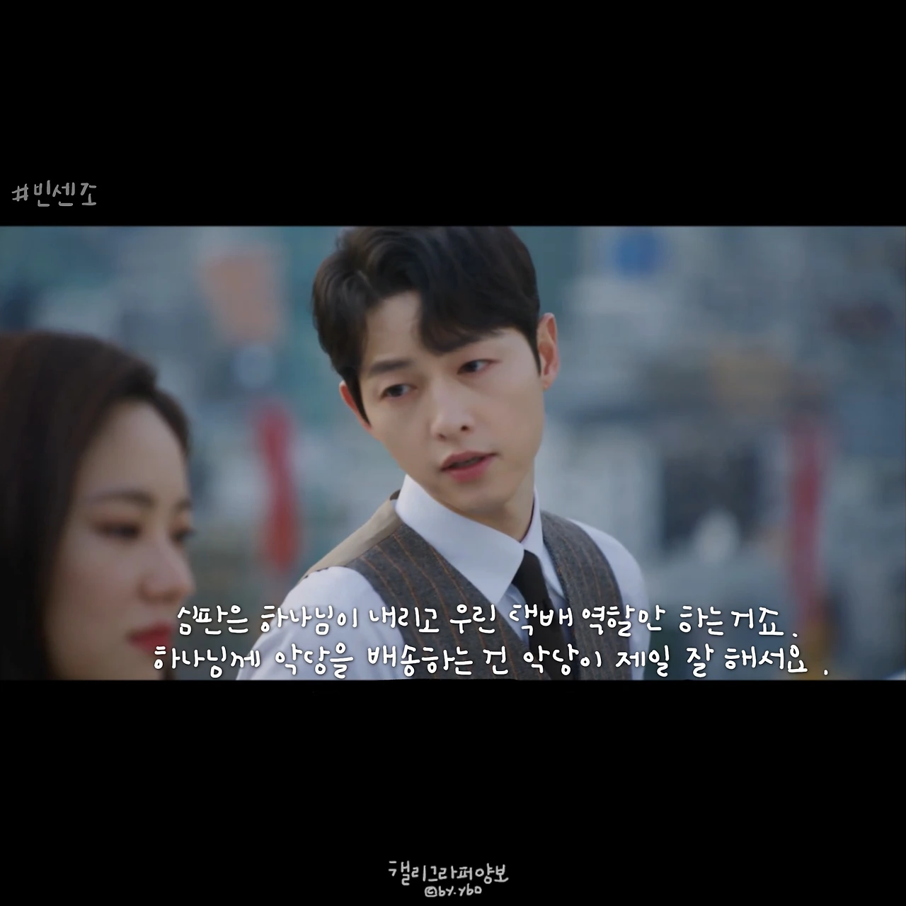<빈센조>는 박재범 작가가 극본을 맡았다. 2010년에는 흔하지 않았던 추리물 <신의 퀴즈>를 그것도 시즌제로 성공시키면서 내 안에 '작가 박재범'은 믿고 보는 작가로 자리메김했다(가수와 동명이인인 것도 한 몫했지만). 그 뒤 박재범 작가는 <김 과장>과 <열혈 사제>를 통해서 사회비리를 특유의 유머와 재치를 녹여 풀어내는 드라마를 만들었다. 보통 사회 비리를 고발하는 드라마의 주인공은 악한 이와 다른 순수함과 정직함, 정의로움을 갖고 있다. 대비되는 인물들의 성격이 결국 선이 악을 이긴다는 믿음을 갖게 하며, 드라마가 전하는 메시지의 강한 축이 되었다.