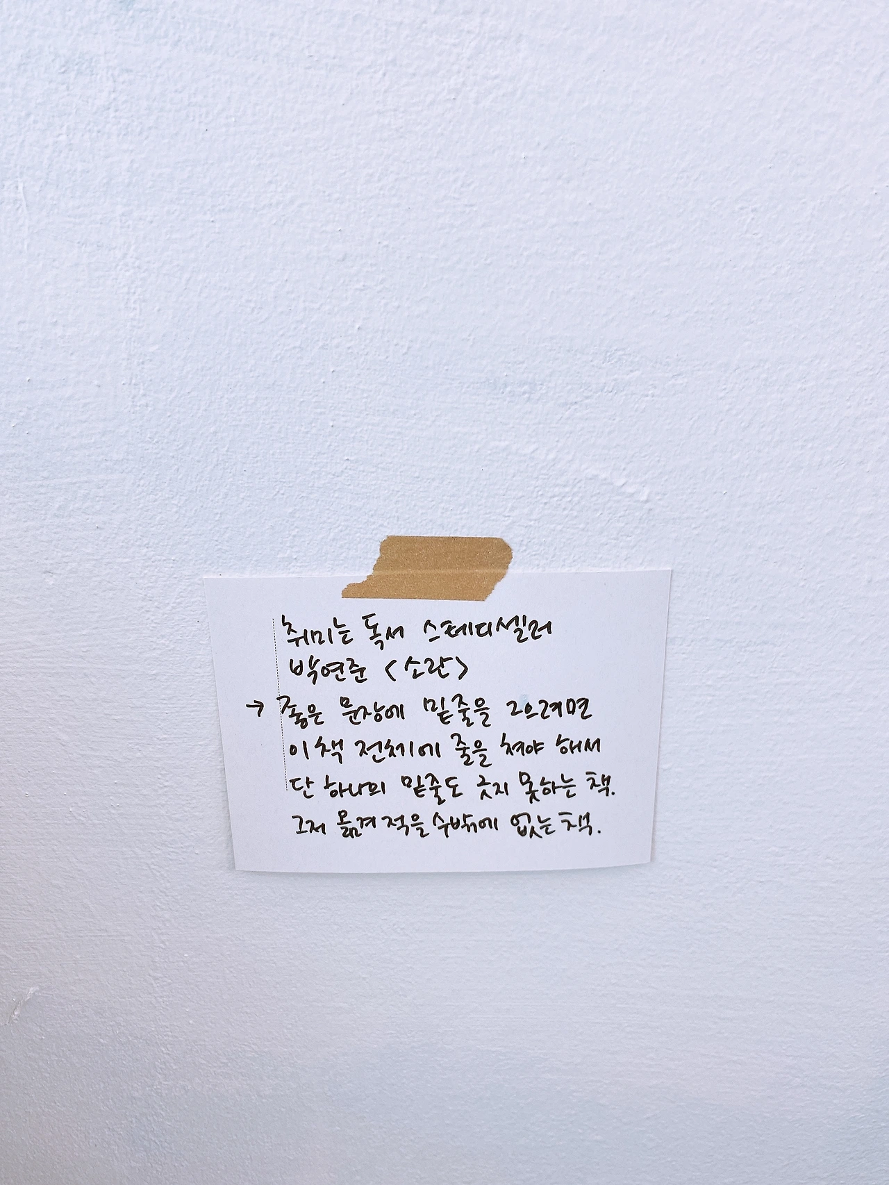 <취미는 독서>에 다녀왔다. 부산에 갈 일이 생겼고 독립 서점을 추천받던 중 해운대에서 멀지 않은 해리단 길에 위치한 <취미는 독서>에 들렸다. 두 평 남짓 되는 공간에 놓인 책들은 그 작은 칸 안에서도 자신들만의 규칙으로 모여 있었다. 꽤 오래 글쓰기에 관한 책장 앞에 서 있었으나, 나는 박연준 시인의 산문집과 유유 출판사에서 나온 ‘어감’에 관한 책을 들고 계산대로 향했다. 작년부터 전자북 플랫폼을 정기 결제하여 이용 중이다. 비좁은 나의 공간엔 나조차 있을 자리가 없어 많은 책을 나눔 하여 보냈고, 전자북 생활에 접어들었다. 그럼에도 나의 공간은 넓어지지 않았다. 여행길에 두 권의 책은 가격보단 무게에서 부담이 되었지만, 여행지에서의 인연이 어찌 사람뿐이겠는가. 이 두 책도 이 곳에서 만난 인연이겠다 싶어 결제를 마쳤고, 이런 식으로 책들은 다시 나의 공간 속으로 들어왔다.