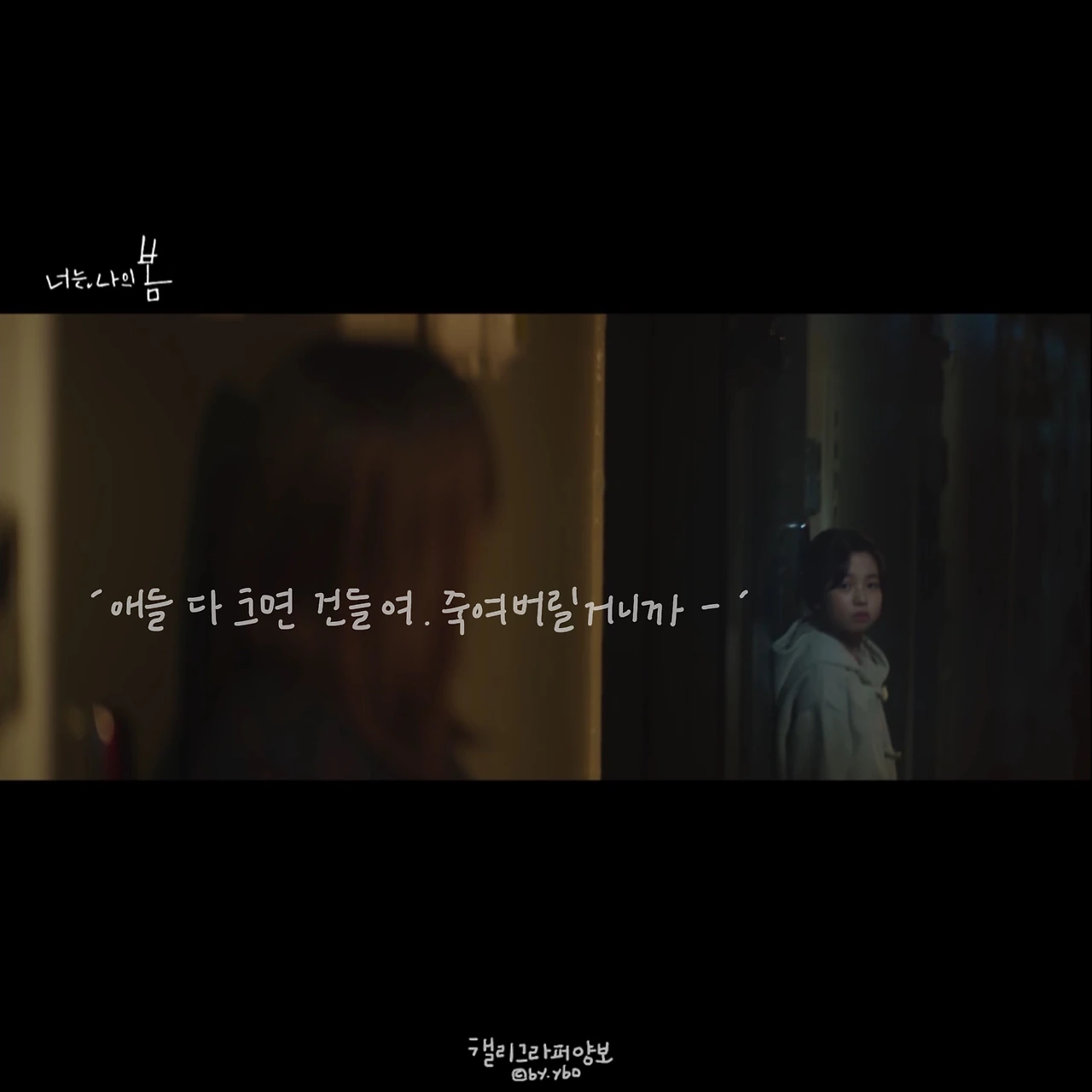 다정의 화면은 자주, 이렇게 벽을 마주하듯 연출된다. 분명 저 공간엔 두 사람이 함께 있는데 말하는 화자만 비추고, 듣는 이가 있을 법한 곳엔 벽을 놓았다. 채준과의 대화 장면도 비슷한 연출이었고, 갑갑한 그 느낌을 1화 초반에 나온 다정의 유년 시절에서도 받았다. 회상 장면을 위한 연출이었다면 색감을 바꾼 것만으로도 충분했을 텐데, 감독은 잘 사용하지 않는 긴 비율의 화면을 사용함으로 답답한 기분을 들게 했다.