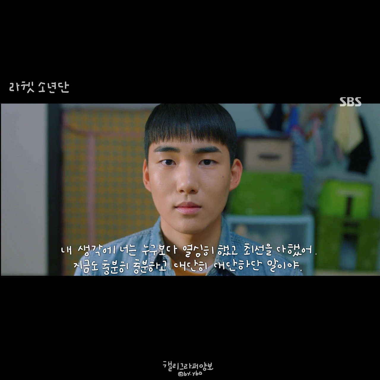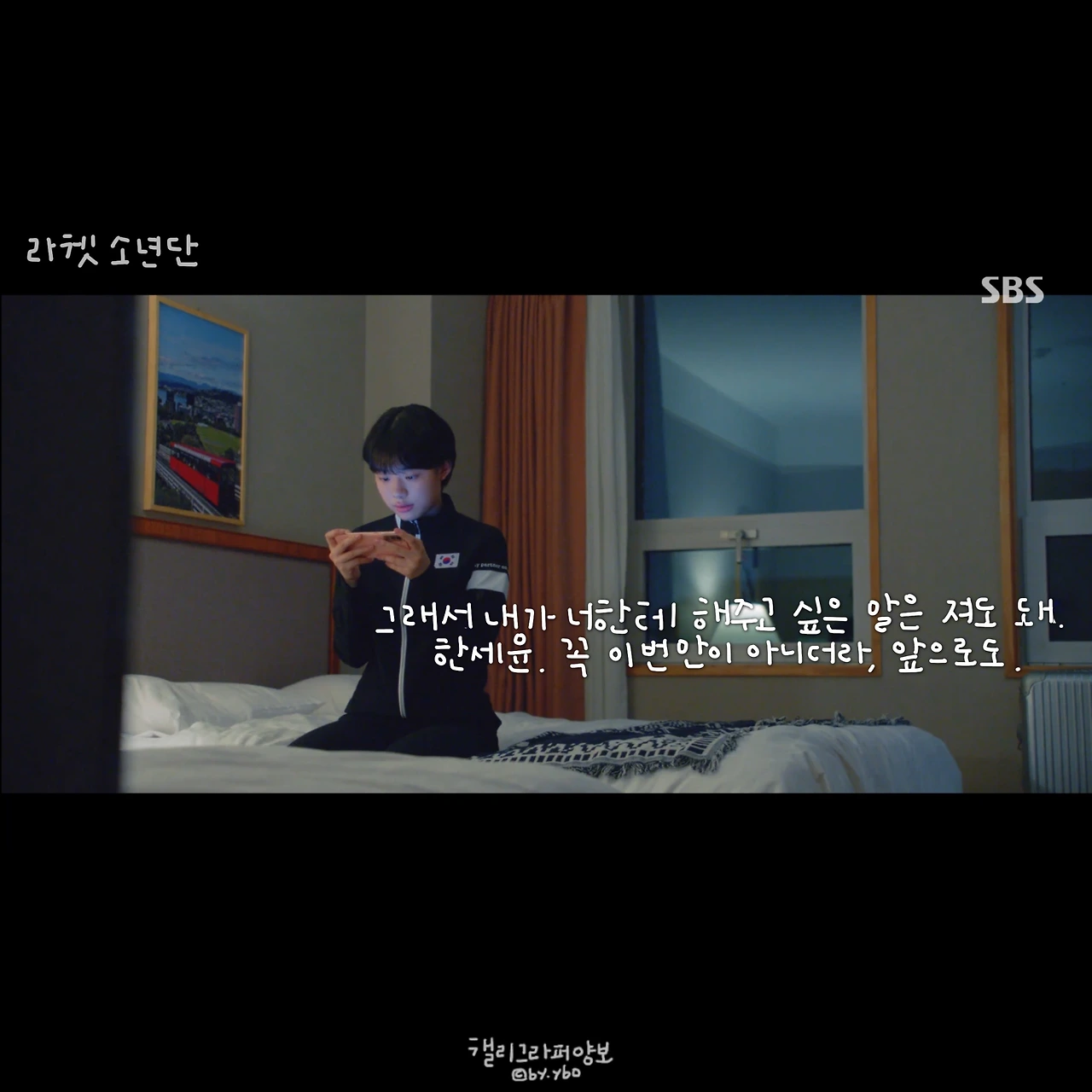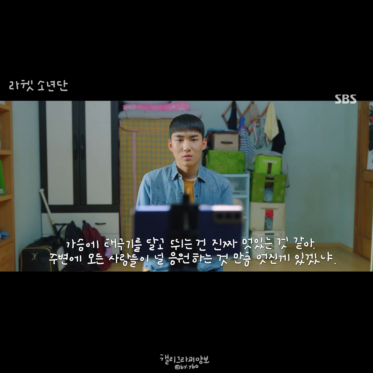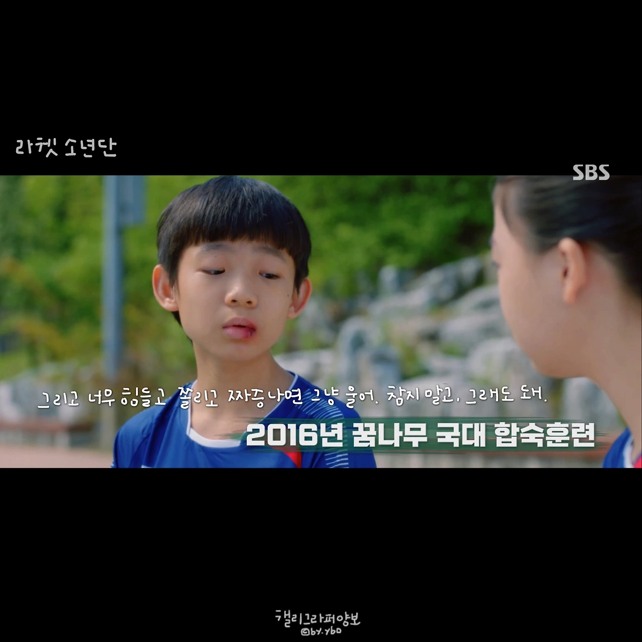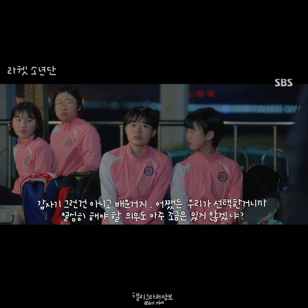 <라켓 소년단>에는 어른들의 방식이 아니라 자신들만의 방식으로 세상을 알아가는 열여섯 아이들, 윤해강, 방윤담, 나우찬, 이용대, 한세윤, 이한솔의 이야기가 담겨있다. 드라마에서 '열어섯'이라는 숫자는 아이들이 살아가고 있는 현재를 설명하는 수식어일 뿐, 그 숫자에 아이들을 가두지 않는다. 생각해보면 아이들이 보여주는 실패와 성공, 경쟁과 협력, 도전을 통한 성장은 열여섯에만 일어나는 게 아닌데.. 오히려 한계를 먼저 생각하며 안될 이유를 찾고, 경험에만 의존해 행동하면서 그런 내가 어른이라며 나의 방식이 옳고 맞다고 생각하진 않았는지, 조금 부끄러워진다.