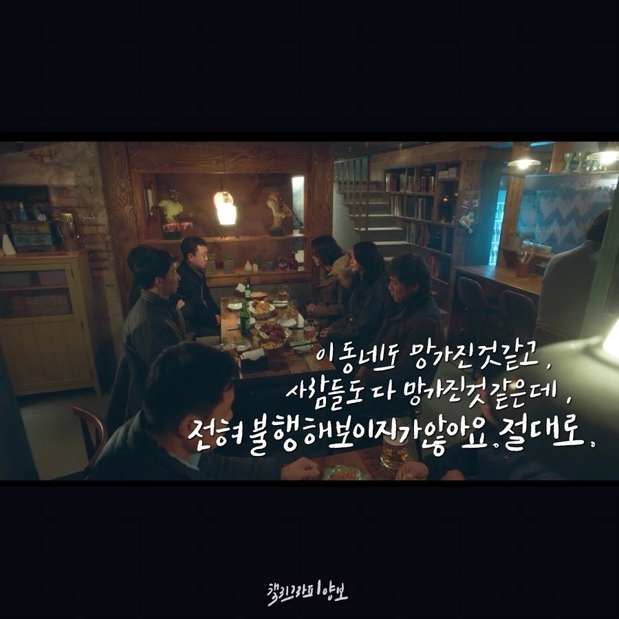 누군가에게 강요하지 않을 인생이라면 자신에게도 강요하지 말라는 겸덕의 말과 지안이 건넨 "파이팅"에 "행복하자"로 대답하던 동훈이 떠올랐다. 처음에는 그냥 지안이 불쌍해서 어린아이가 지고 있는 삶의 무게가 안쓰러워 행복하자고 말했다. 하지만 그 문장 끝에 “우리”가 붙었다. 행복해지는 삶은 지안뿐 아니라 자신에게도 필요했음을 인정함이 아니었을까.