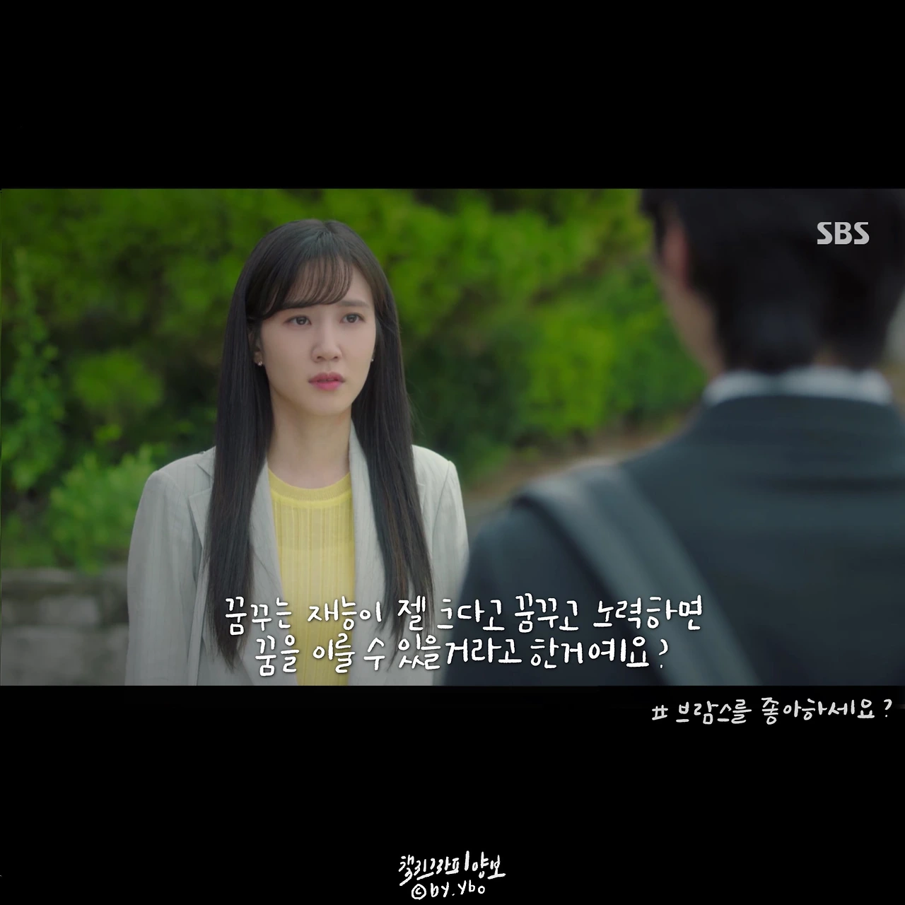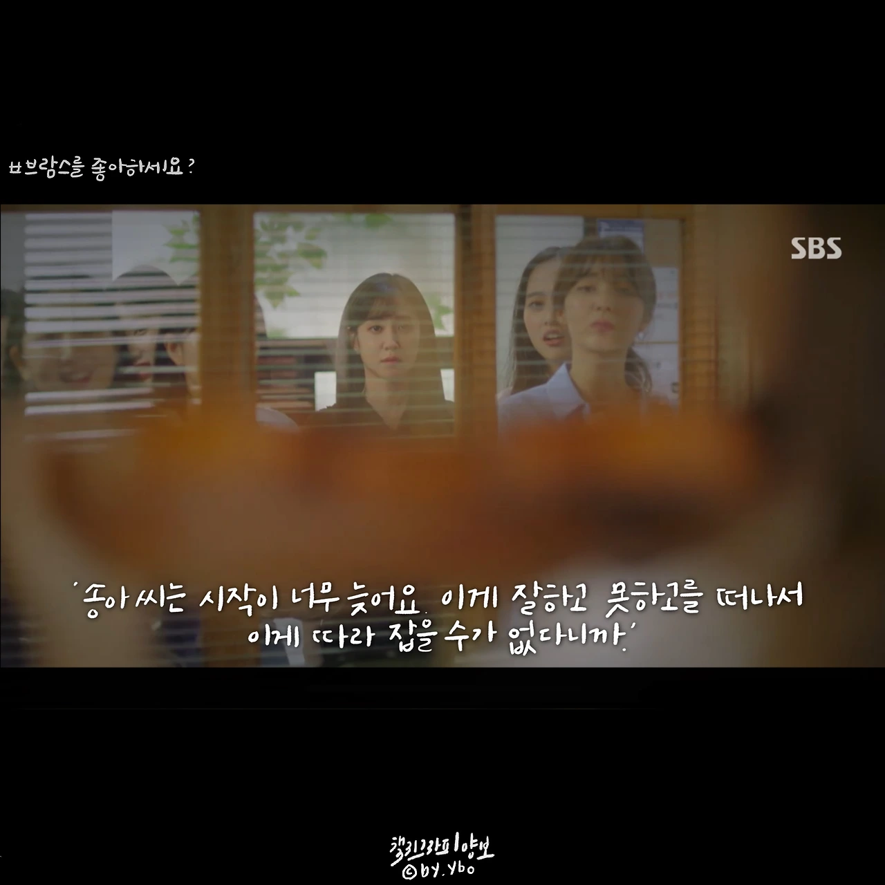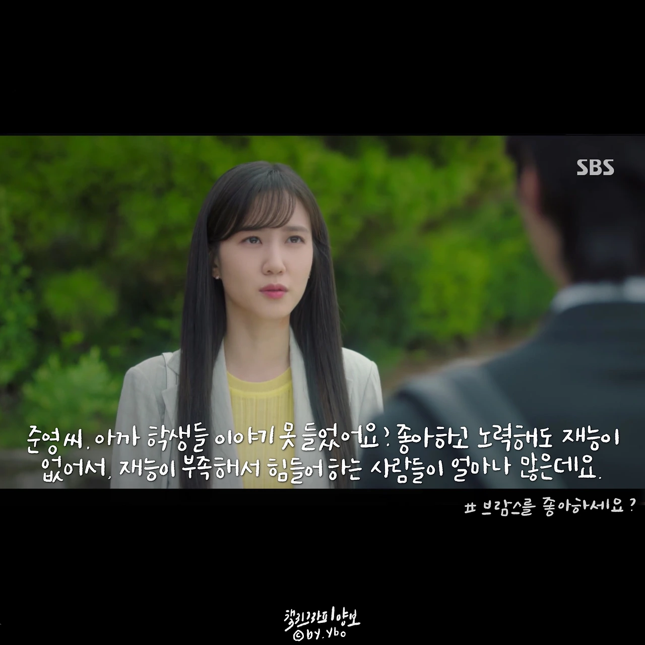 나는 아직도 드라마 <미생>을 보지 못 했는데, 그건 내가 너무나 ‘미생'이라 과몰입할 것 같아서다. 비슷한 맥락으로 '브람스'가 방영되었을 당시 자신이 하고 있는 고민의 모양과 닮아서 '브람스'를 보는 게 힘들다고 하신 분들이 있었다. 송아가 하는 고민은 지독히도 현실적이라, 비슷한 고민으로 힘들었던 때를 떠올릴게 했나 보다. 음대에서 송아가 겪는 갈등은 드라마에게 '음대 다큐멘터리'라는 칭호를 붙일 정도로 실제 환경과 비슷했고, 그런 경험이 있었음을 고백하던 댓글들도 기억난다. 드라마를 쓴 류보리 작가가 음대 출신이라 극 중에 담긴 고민과 갈등을 조금 더 현실감 있게 녹였던 게 아닐까 생각된다. 이렇듯 <브람스를 좋아하세요?>는 드라마가 갖고 있는 서정적인 분위기를 지키느냐 메시지를 놓치지 않는다.