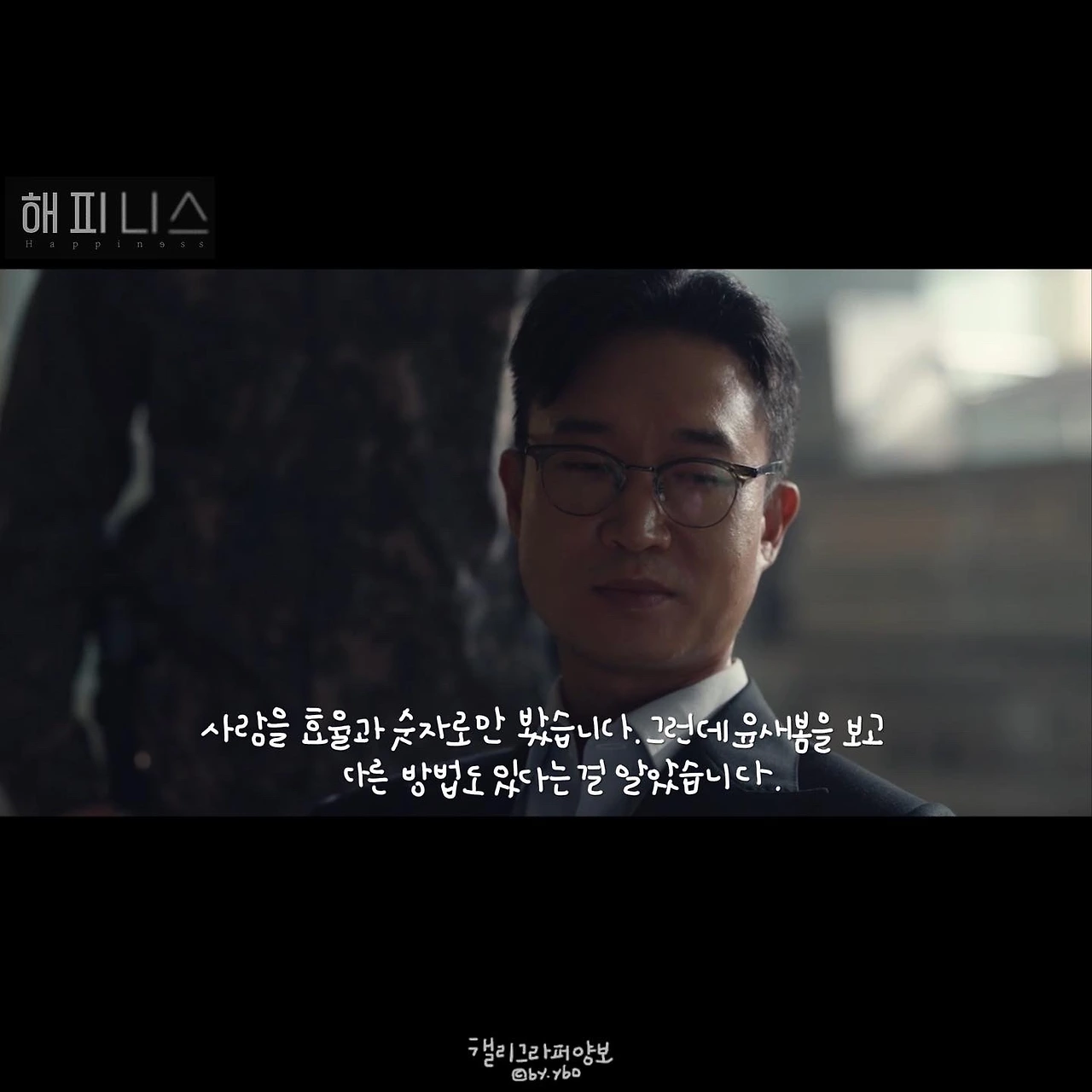 전작 #왓쳐 에서도 인간다움은 어디서 오는지 묻던 작가였다. 그 질문이 #해피니스 에서는 '행복'에 닿은 듯 하다. 일상이 무너지고 기존의 가치가 훼손되는 상황 속에서도 "변하지 않는 것은 어떤 상황에서든 행복을 추구하고 싶은 인간의 마음뿐이다." 새봄(한효주 분)이 이현에게 결혼을 제안한 건, 그녀에게 있어 행복은 자신의 집을 소유하는 것이었기 때문이다. 임대 주택을 분양받기 위해 한 위장 결혼이지만 감염병 속에 무엇이 기본이고, 일상은 어떤 것이었는지 혼란한 시간을 보내면서 그녀의 행복은 사랑하는 사람과 함께 있는 것이라는 갈 알게 된다. 그래서 하나 남은 치료제를 다른 사람에게 줄 수 있었던 것이다. 그 사람도 다시 맞은 일상에서 ‘행복’하길 바랬으니까. 작은 마음이라 생각될지 모르지만, 그런 시선이 사람을 살릴 수 있는 또다른 방법이 될 수 있다는 걸 사람을 숫자와 효율로만 보던 한 중령의 후회섞인 대답을 통해 전한다.