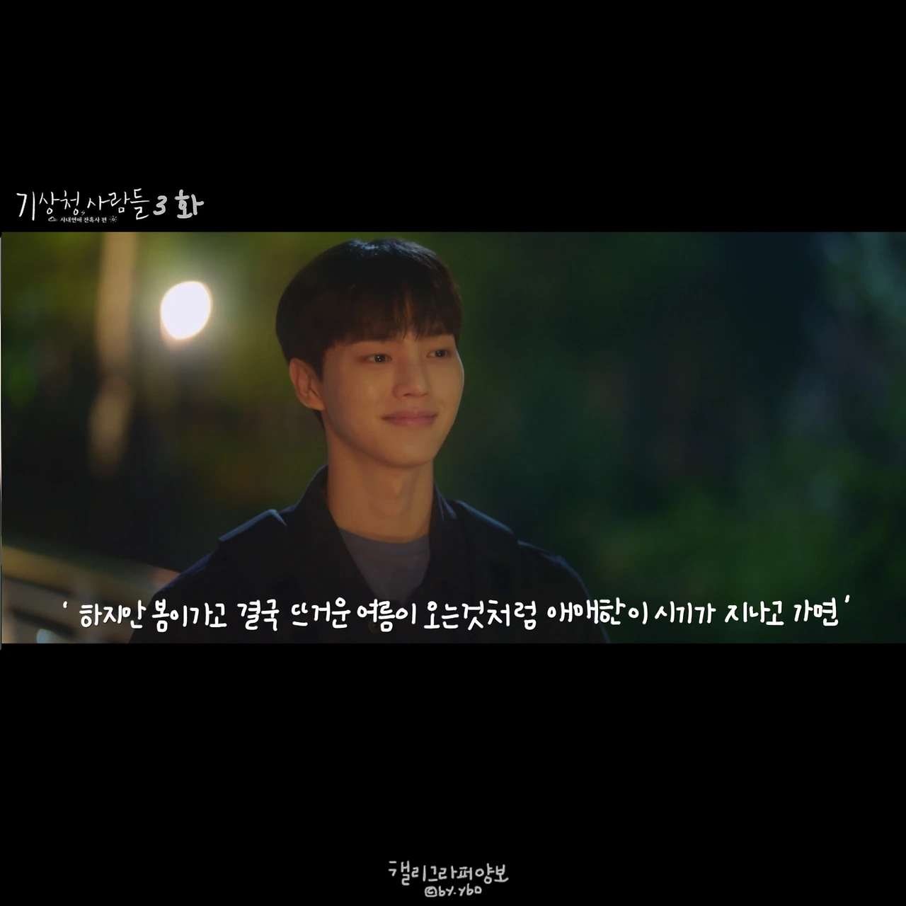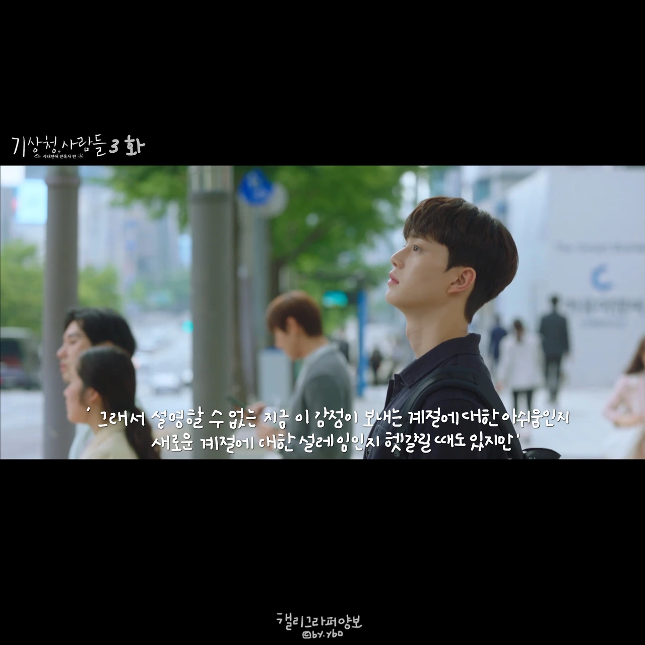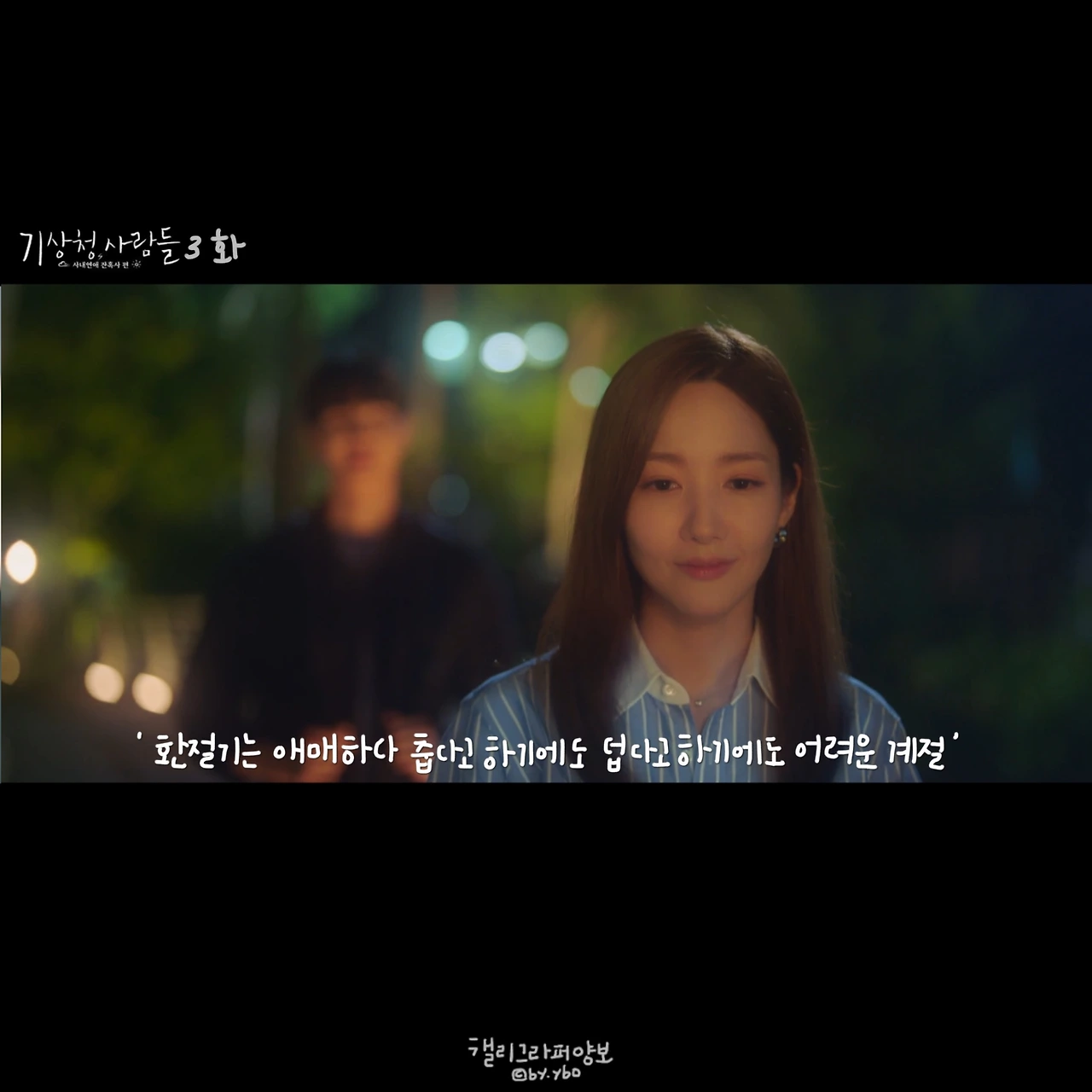드라마 <기상청 사람들>은 기상청에서 생기는 일과 사랑을 그리고 있다. 기상청 안에서도 일기 예보를 결정하는 예보관들의 일을, 그리고 그 안에서 피어나는 ‘사내연애’의 잔혹함을 설레게 담아내고 있어 시작부터 많은 시청자들의 사랑을 받고 있다. 이 드라마에서 내가 느끼는 또 다른 재미는 날씨 용어에 빗대 상황이나 각 자의 마음을 풀어낸 내레이션에 있다. 환절기. 시우(송강 분)는 유진(유라 분)이 떠나고 그 무렵 알게 된 하경(박민영 분)에게 호감이 생기는 자신의 상황을 애매한 날씨인 환절기에 비유한다. 하경 또한 기준(윤박 분)이 떠나고 이시우라는 사람의 등장에서 계절이 변하는 환절기를 떠올린다.