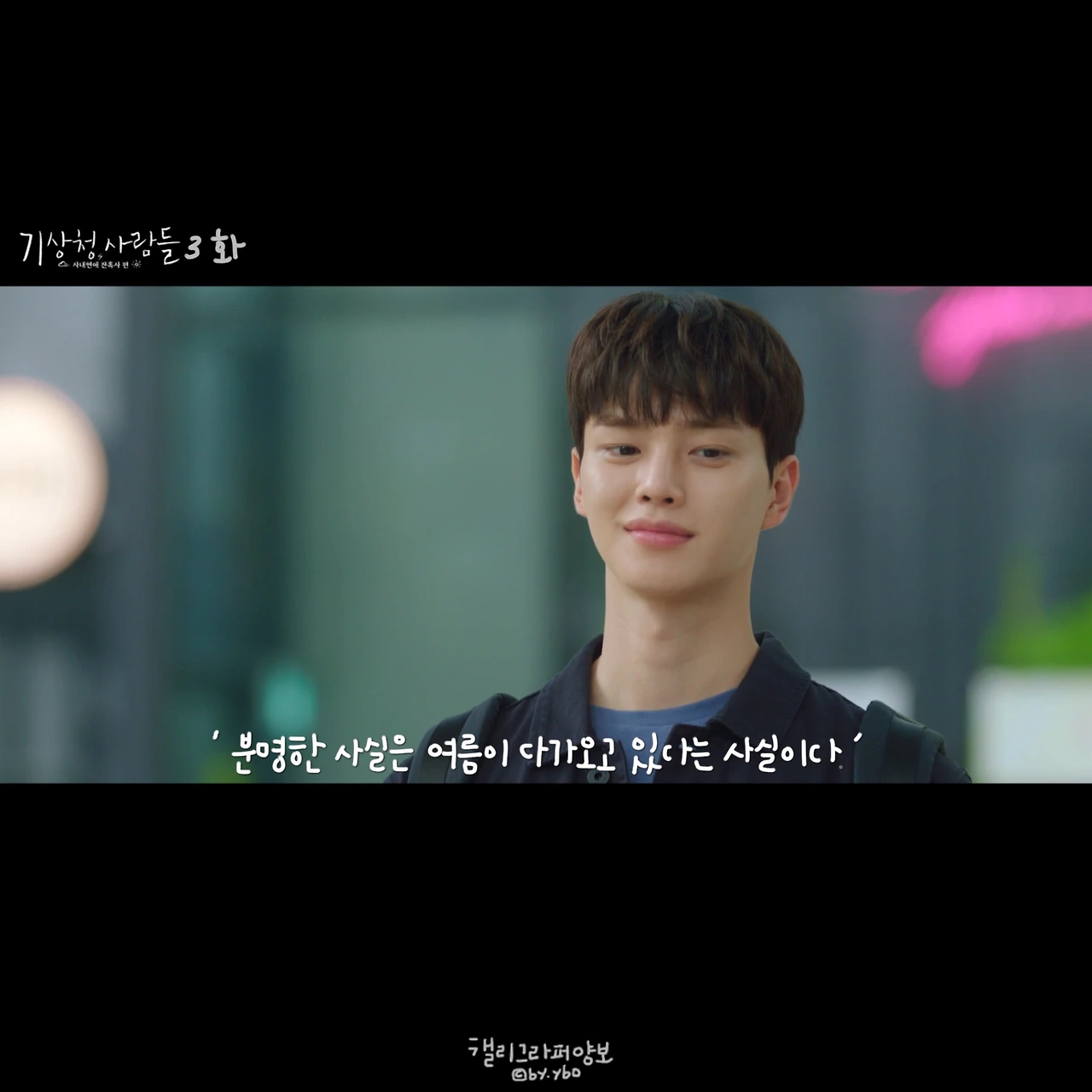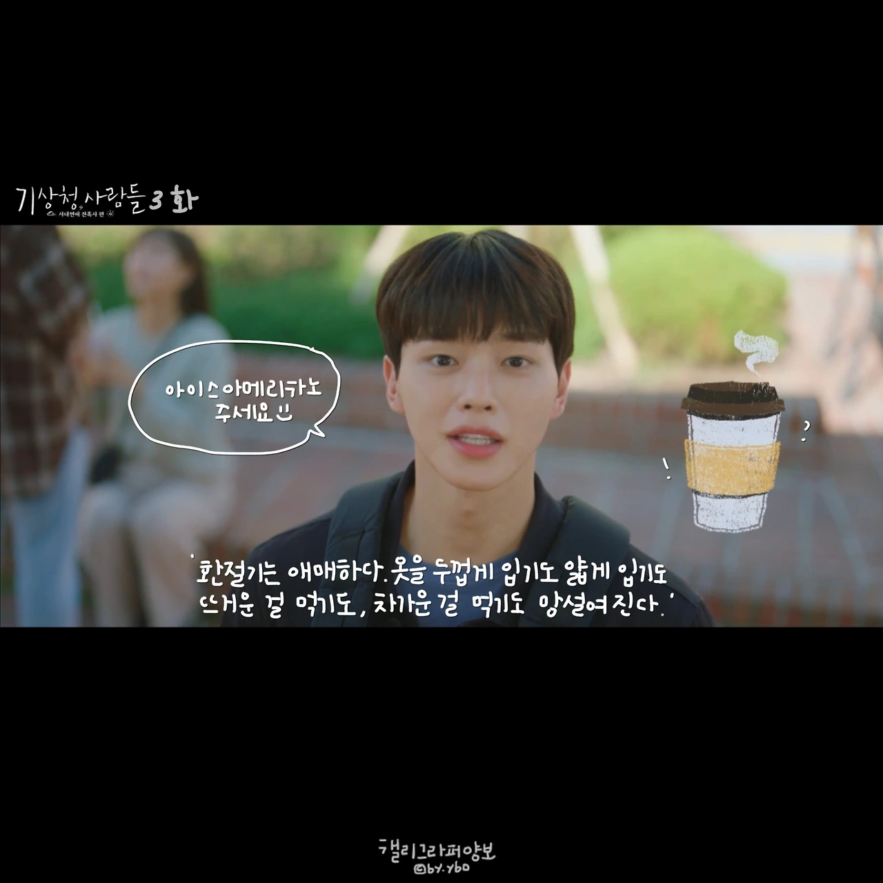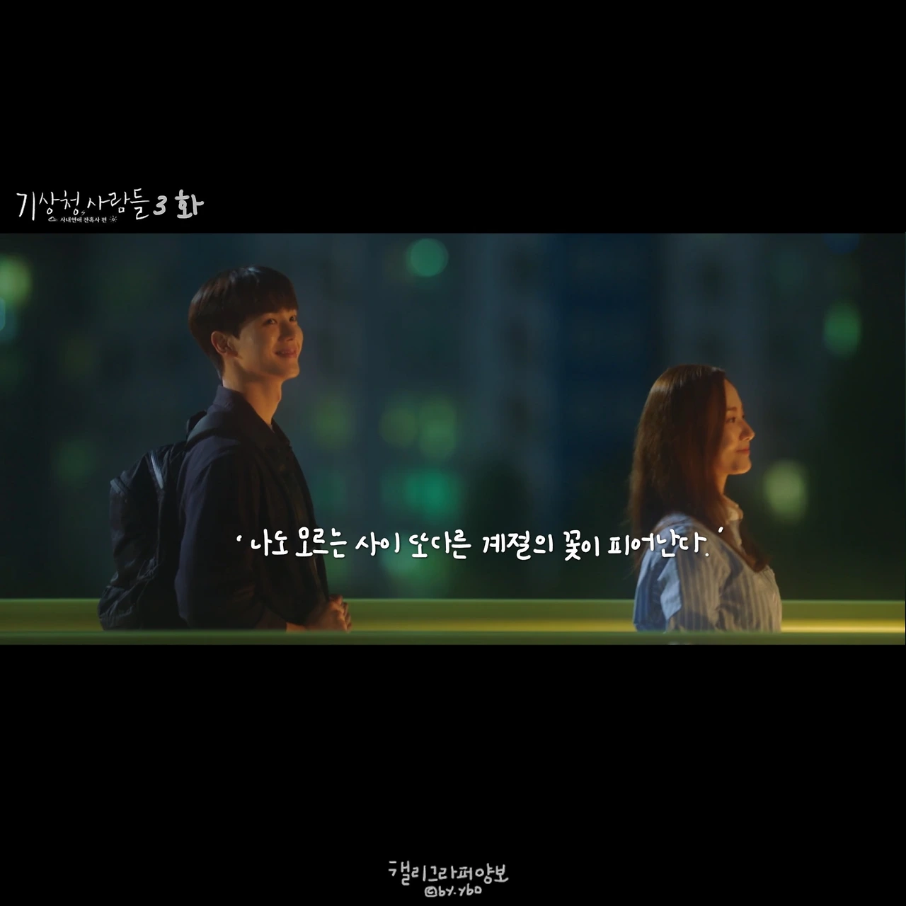 드라마 <기상청 사람들>은 기상청에서 생기는 일과 사랑을 그리고 있다. 기상청 안에서도 일기 예보를 결정하는 예보관들의 일을, 그리고 그 안에서 피어나는 ‘사내연애’의 잔혹함을 설레게 담아내고 있어 시작부터 많은 시청자들의 사랑을 받고 있다. 이 드라마에서 내가 느끼는 또 다른 재미는 날씨 용어에 빗대 상황이나 각 자의 마음을 풀어낸 내레이션에 있다. 환절기. 시우(송강 분)는 유진(유라 분)이 떠나고 그 무렵 알게 된 하경(박민영 분)에게 호감이 생기는 자신의 상황을 애매한 날씨인 환절기에 비유한다. 하경 또한 기준(윤박 분)이 떠나고 이시우라는 사람의 등장에서 계절이 변하는 환절기를 떠올린다.
