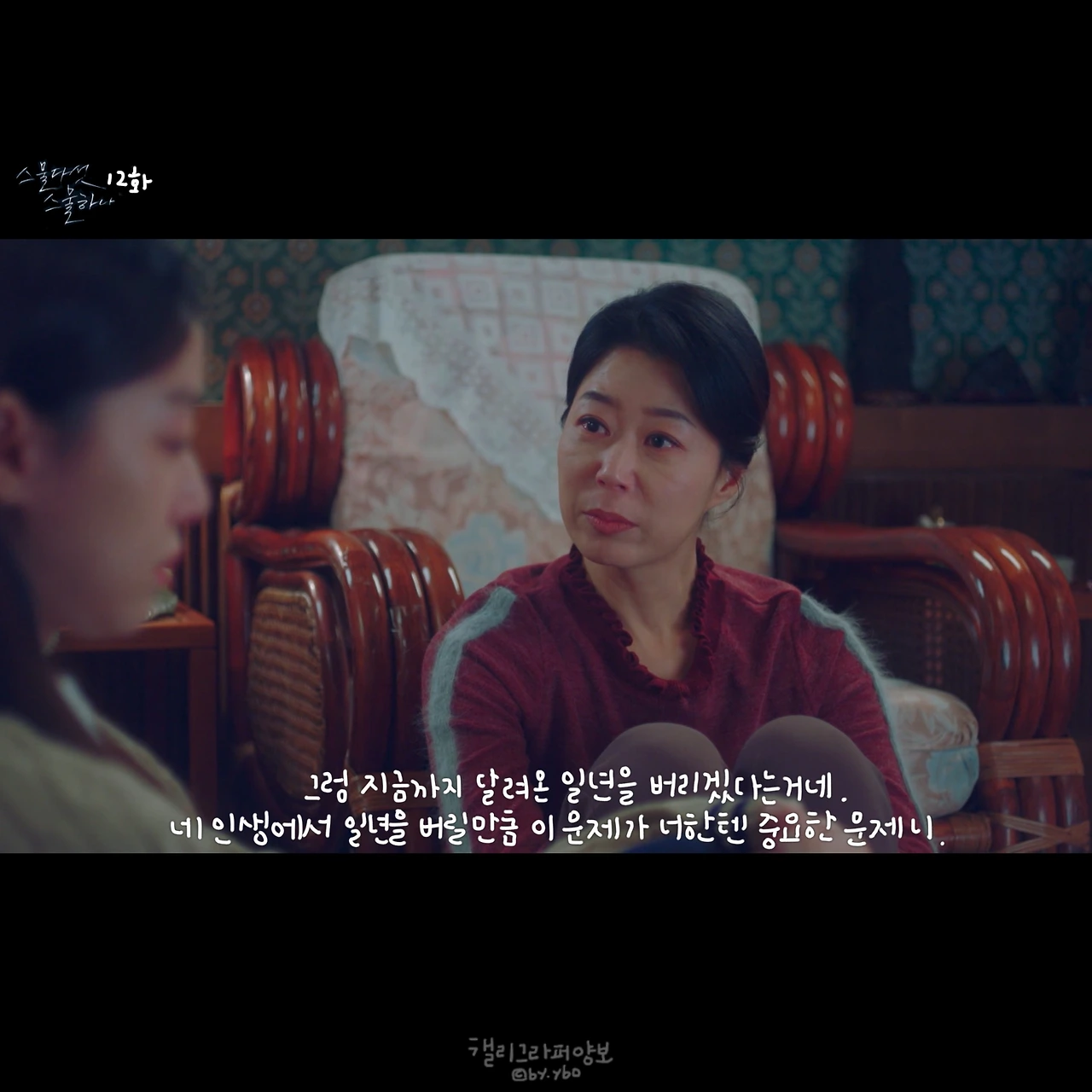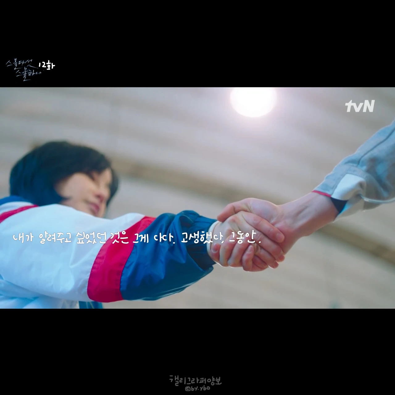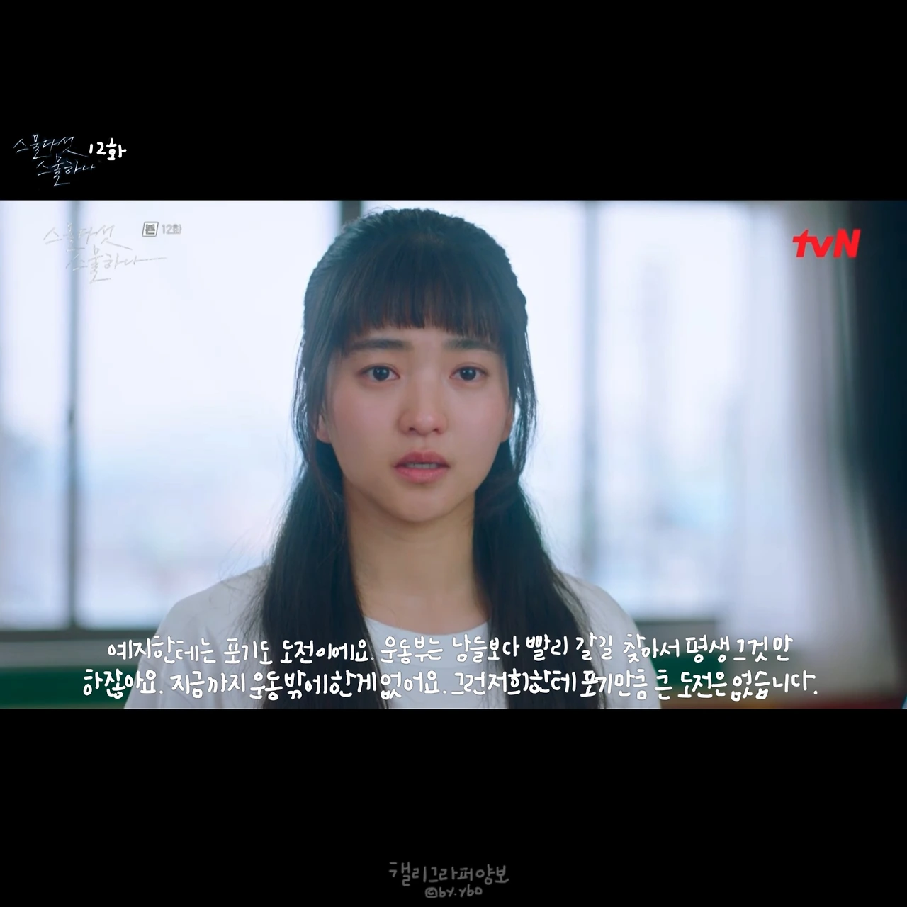 승완과 예지가 휘어지는 법을 모르고 부러진 이번 일들을 통해 나는 이들이 그만둬도 괜찮고, 때론 멈췄다가도 괜찮다는 것을 배웠단 생각이 들었다. 어쩌면 이번 결정으로 남들보다 1-2년 늦어질 수 있다. 하지만 자신이 살아가야 할 인생의 방향을 스스로 점검하고 기틀을 세웠기에 결정적인 순간에 역전도 가능할지 모른다. 늦었다고 볼 수 없다. 타인의 선택을 이해하려는 자세와 그로 인한 존중 그리고 자신이 내린 선택에 책임을 지는 법도 함께 배운 시기가 아니었을까 생각한다. 이런 경험은 보호와 안내를 받을 수 있는 어린 시기에 많이 이뤄질수록 좋다. 나는 몇 번의 그만두는 과정을 통해 약 십 년간 익힌 경험과 깨달음을 간접적으로 경험하며 생각해볼 수 있는 드라마에서 많이 이야기되고 있는 게 참 고마웠다. 이런 장면을 보다 아빠에게 그 때 걱정보다 이해가 먼저 였다면 좋았을 것 같다고 말한 적이 있다. 아빠는 내 말이 무슨 뜻인지 보다 쉽게 이해하셨고, 여전히 잔소리가 많지만 그래도 예전같이 권면만을 하지 않는다. 이해를, 노력을, 믿음을 보여주셨다.