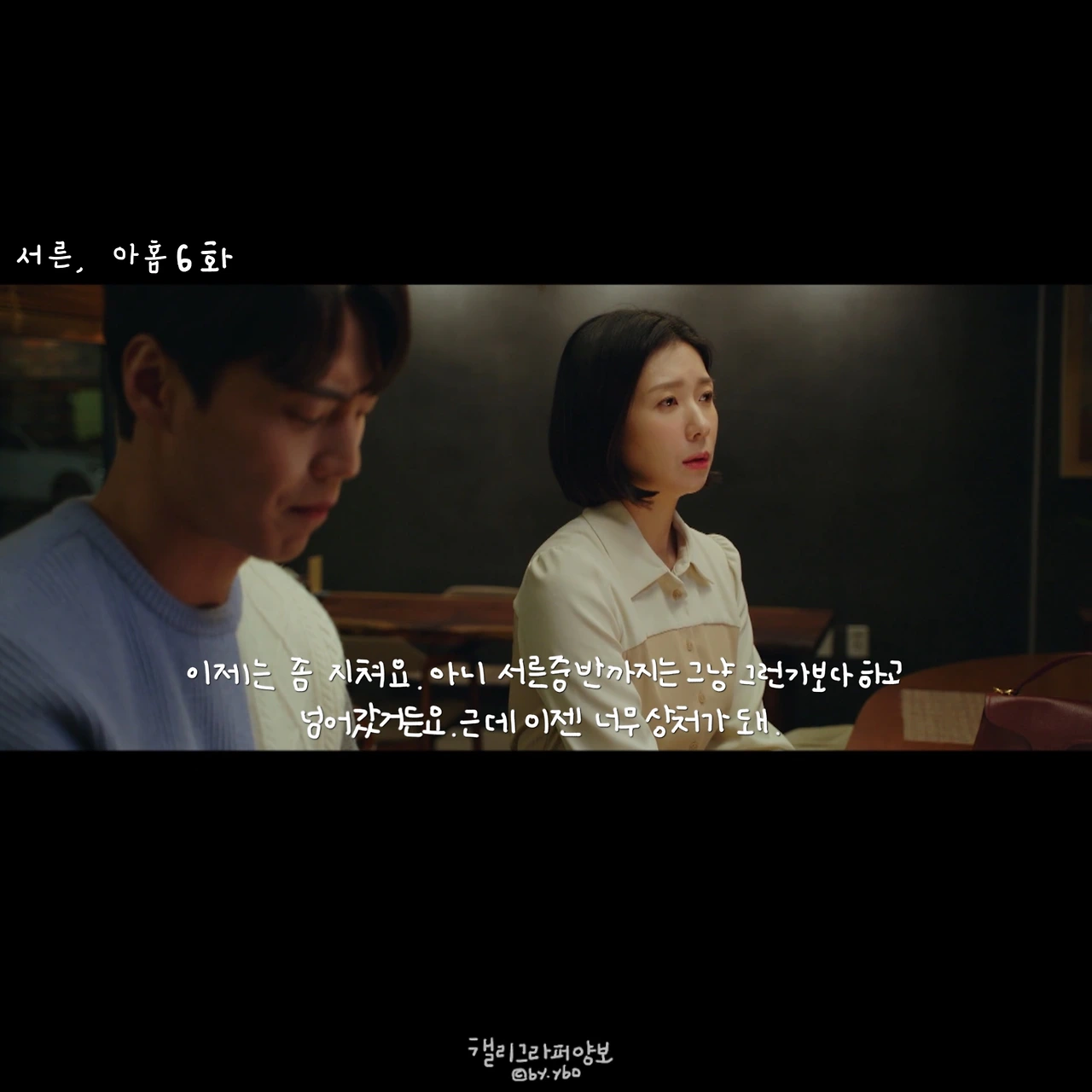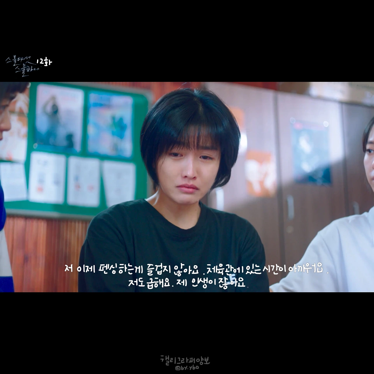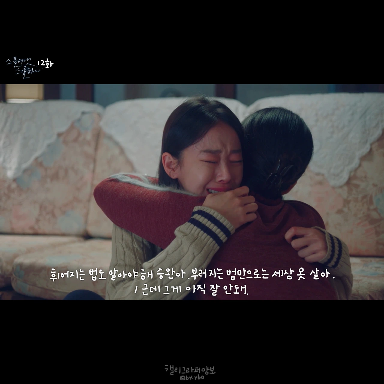 승완과 예지가 휘어지는 법을 모르고 부러진 이번 일들을 통해 나는 이들이 그만둬도 괜찮고, 때론 멈췄다가도 괜찮다는 것을 배웠단 생각이 들었다. 어쩌면 이번 결정으로 남들보다 1-2년 늦어질 수 있다. 하지만 자신이 살아가야 할 인생의 방향을 스스로 점검하고 기틀을 세웠기에 결정적인 순간에 역전도 가능할지 모른다. 늦었다고 볼 수 없다. 타인의 선택을 이해하려는 자세와 그로 인한 존중 그리고 자신이 내린 선택에 책임을 지는 법도 함께 배운 시기가 아니었을까 생각한다. 이런 경험은 보호와 안내를 받을 수 있는 어린 시기에 많이 이뤄질수록 좋다. 나는 몇 번의 그만두는 과정을 통해 약 십 년간 익힌 경험과 깨달음을 간접적으로 경험하며 생각해볼 수 있는 드라마에서 많이 이야기되고 있는 게 참 고마웠다. 이런 장면을 보다 아빠에게 그 때 걱정보다 이해가 먼저 였다면 좋았을 것 같다고 말한 적이 있다. 아빠는 내 말이 무슨 뜻인지 보다 쉽게 이해하셨고, 여전히 잔소리가 많지만 그래도 예전같이 권면만을 하지 않는다. 이해를, 노력을, 믿음을 보여주셨다.