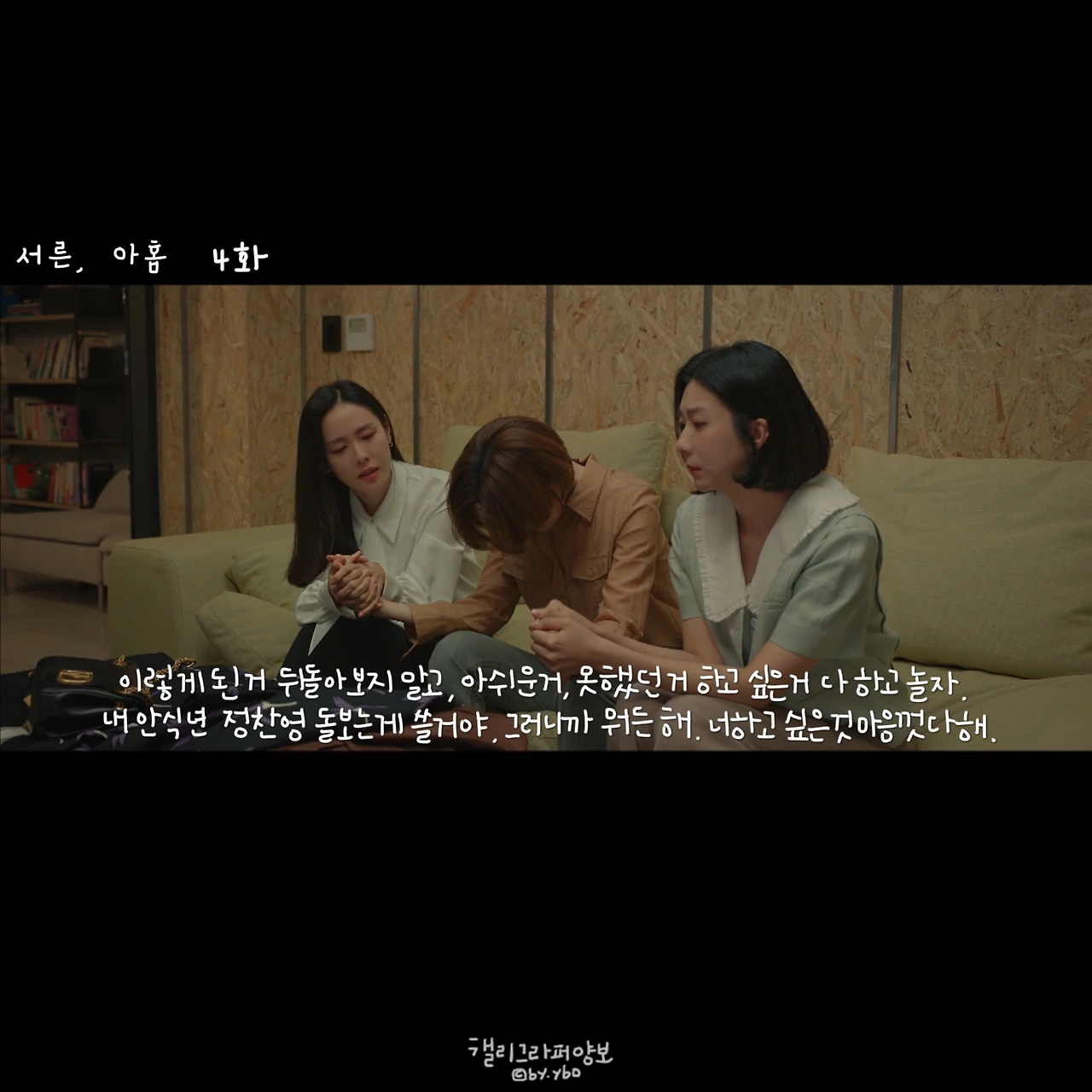 마흔을 문턱에 둔 세 여자의 우정과 사랑, 일에 대한 이야기를 기대하며 막연히 <멜로가 체질(jtbc, 2019)>과 같은 결을 상상했던 내게 전미도 배우.. 아니 전미도 배우가 연기하는 찬영이란 인물의 장례식이 치러지는 1회의 오프닝은 가히 충격이었다. 동의하지 않을 수도 있겠지만, 개인적으로 찬영이 불륜에 가까운 연애를 하고 있는 상황과 선우(연우진 분)의 동생 소원(안소희 분)이 성인이 되어 파양 되면서 받은 상처로 인해 유흥주점에서 일한다는 설정은 소원의 방황을 굳이 이런 모습으로 담았어야 했을까 하는 생각이 들어 솔직히 하차를 고민하게 했다.