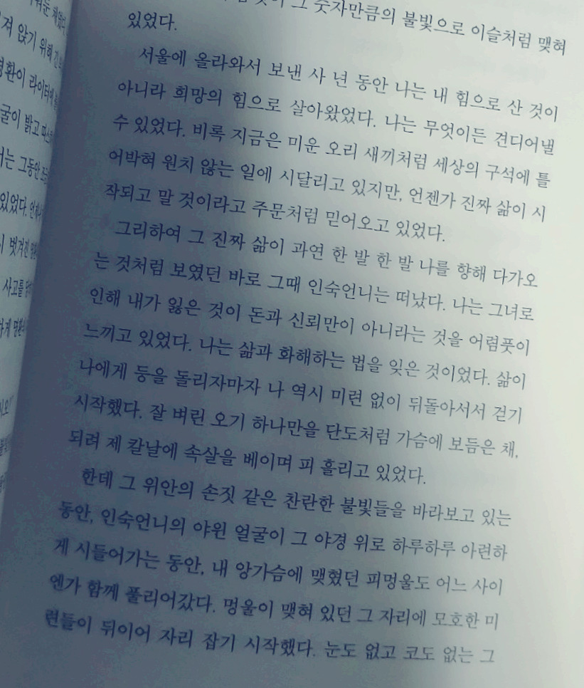 서울에 올라와서 보낸 사 년 동안 나는 내 힘으로 산 것이 아니라 희망의 힘으로 살아왔었다. 나는 무엇이든 견디어낼 수 있었다. 비록 지금은 미운 오리 새끼처럼 세상의 구석에 틀어박혀 원치 않는 일에 시달리고 있지만, 언젠가 진짜 삶이 시작되고 말 것이라고 주문처럼 믿어오고 있었다.