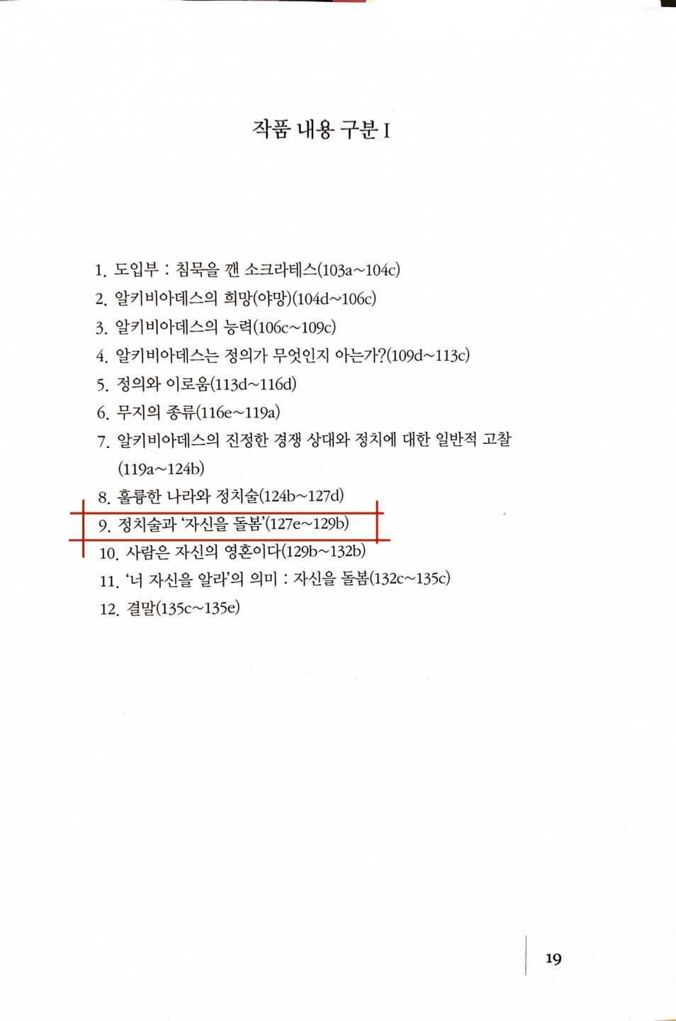 2) 대략적으로 말한다고 서술한 이유는, 9장의 대화는 실질적으로 129b에서 소크라테스의 첫 번째 대사로 끝이 난다. 또한, 제10장, 11장에서 돌봄과 영혼에 관해 말했다는 느낌이 들었기 때문이다. ー즉 9장은 10, 11장을 위한 발판이라고 생각된다. 그렇다고 해서 중요하지 않다는 게 아니다. 9장을 대강 넘겨버리면 뒤의 10, 11장을 이해하지 못하는 불상사가 발생하게 된다.