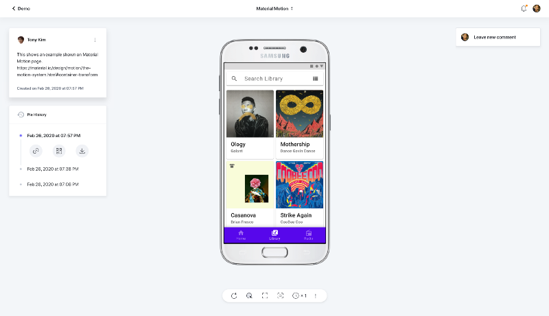 하지만 실시간이 아닌 방법으로도 피드백을 빠르게 주고받을 수 있습니다. ProtoPie for Teams를 사용하면 프로토타입 바로 오른쪽에 코멘트를 달 수 있으며, 왼쪽에서는 이전 버전의 프로토타입을 확인할 수 있습니다.