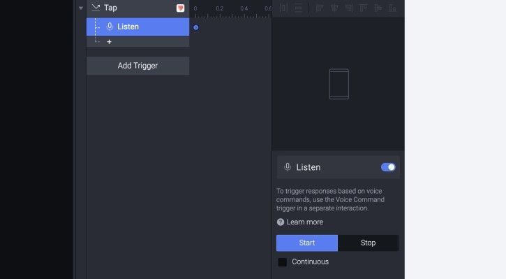 기본적으로 프로토타입은 음성 인식 기능이 비활성화되어 있습니다. 먼저, Listen response를 사용하여 프로토타입의 듣기 기능을 활성화하거나 비활성화 하세요.