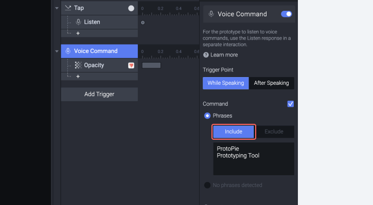 그리고 Voice Command trigger를 사용하여 실제 음성을 기반으로 response가 trigger되는 인터랙션을 만들어 보세요. 사용자가 말하는 동안, 또는 사용자가 말을 멈추었을 때에 Voice Command trigger를 작동시킬 수 있습니다. 또한, 특정 구문을 command로 포함하거나 제외할 수도 있습니다.