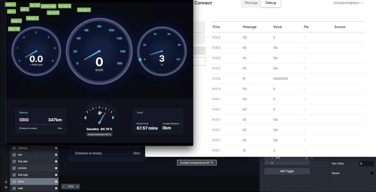 3. 이제 Bridge App을 사용해 OBD 신호들을 해석하고, ProtoPie Connect가 이 신호들을 이해하는지 확인할 수 있습니다.