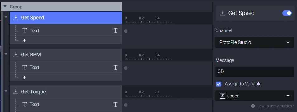 위 이미지를 보면 ProtoPie Connect는 0에서 255 사이의 값을 가진 "OD"라는 메시지를 수신하고 있습니다. Bridge App은 OBD 테이블에서 선택한 XX 신호를 해석할 수 있으며, 필요한 경우 앱을 편집해 더 많은 신호를 받을 수 있습니다. 이제 프로토타입이 이러한 신호들을 이해하고 인터랙션에 사용할 수 있도록 해보겠습니다.