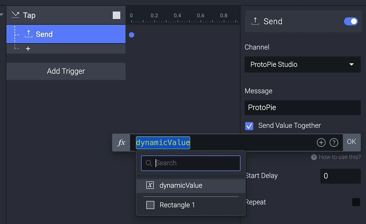 Send response와 Receive trigger는 메시지를 주고받으며 서로 정보를 전달하는데요. dynamic values를 전송하고 싶다면 "Send Value Together" 옵션을 체크하면 됩니다.