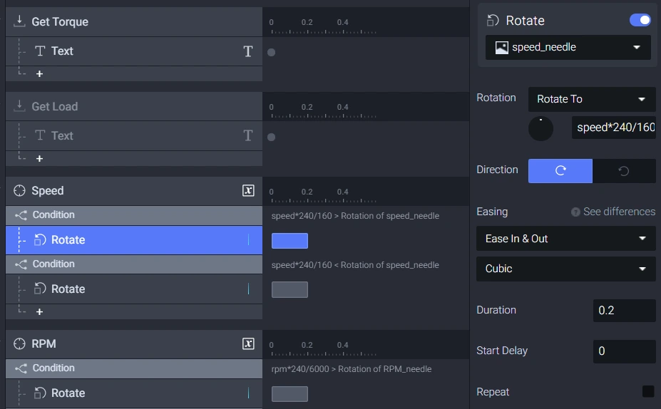 마지막으로, 게이지 바늘을 회전시키기 위해 Rotate Response 섹션 아래 변수로 "Rotate To" 옵션을 사용합니다. 이제 준비가 끝났습니다. 이 프로토타입에서는 실제 차량에서 ProtoPie Player를 향해 신호들이 한 방향으로 흐릅니다.