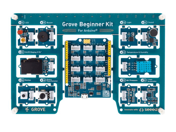 이번 가이드에서는 blokdots(영문)에서 권장하는 아두이노 Grove 보드를 사용합니다. 아두이노 Grove 보드는 사용이 매우 간단하며 구성 요소에 와이어링이 별도로 필요하지 않습니다. Seeed Studio의 Grove 아두이노 보드에는 10개의 사전 와이어링 모듈이 있으며, 대부분은 blokdots에서 지원됩니다.