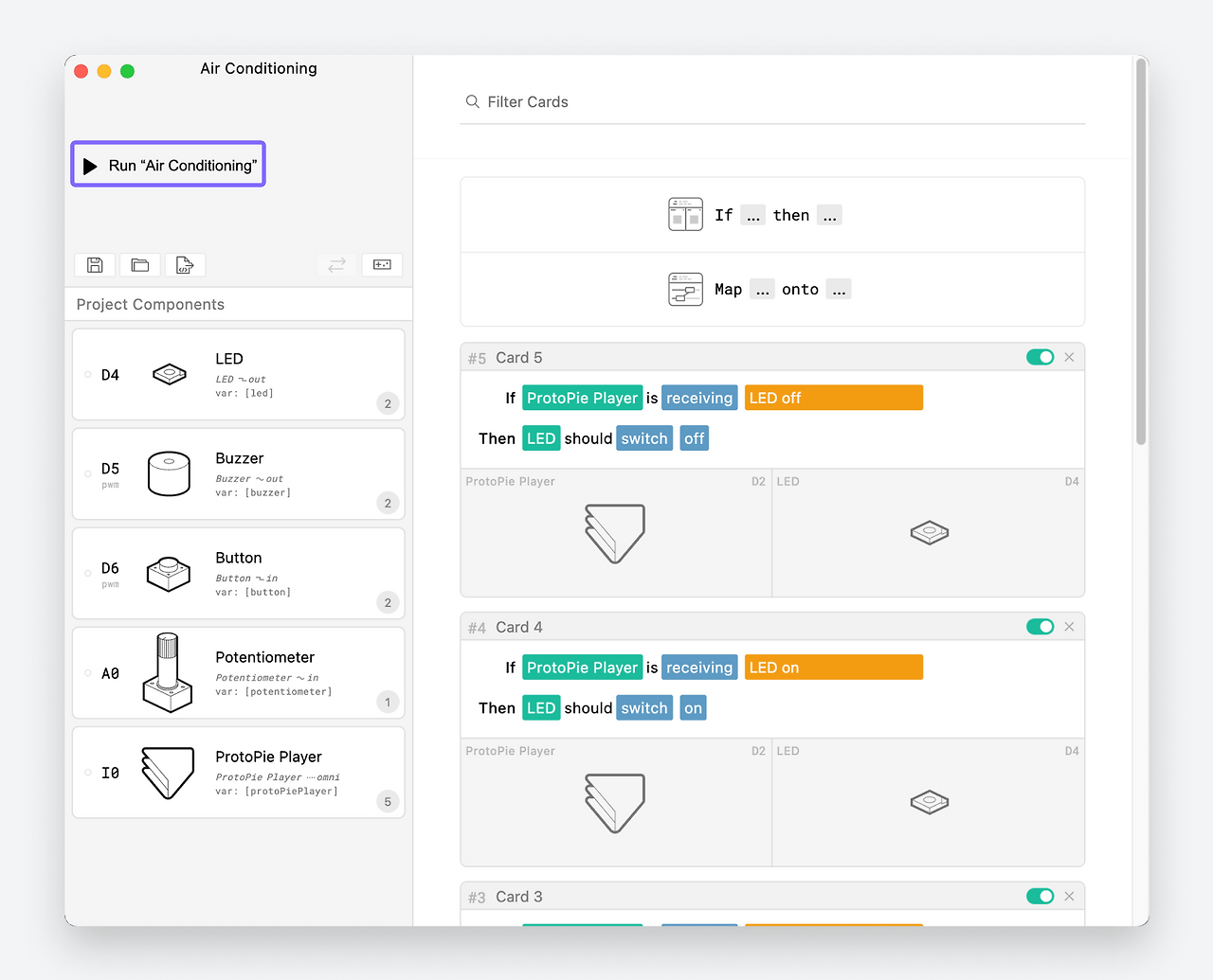 ProtoPie의 값을 사용하여 LED를 페이드인 및 페이드아웃하려면, blokdots의 Map... onto 카드를 사용하여 ProtoPie의 값을 하드웨어 구성 요소에 매핑할 수 있습니다.