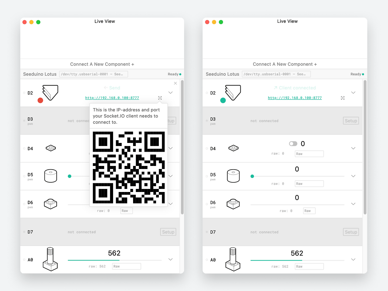 QR을 스캔하거나 주소를 수동으로 입력하여 ProtoPie Player를 연결합니다. 이 설정을 마치면 라인 뷰가 아래와 같아야 하며, 정상적으로 작동하는 경우 아이콘의 왼쪽 하단에 있는 작은 연결 표시기가 녹색으로 바뀝니다.