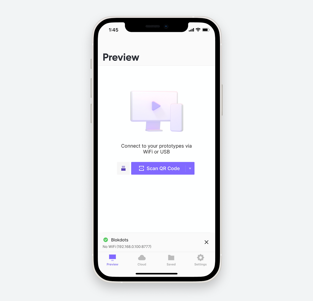 ProtoPie Player에서 프로토타입을 미리 보려면, ProtoPie Studio에서 QR 코드를 스캔하세요. Player와 Studio가 모두 동일한 네트워크를 통해 연결되어 있는지 확인합니다. 그렇지 않은 경우, USB를 사용하여 연결할 수도 있습니다.