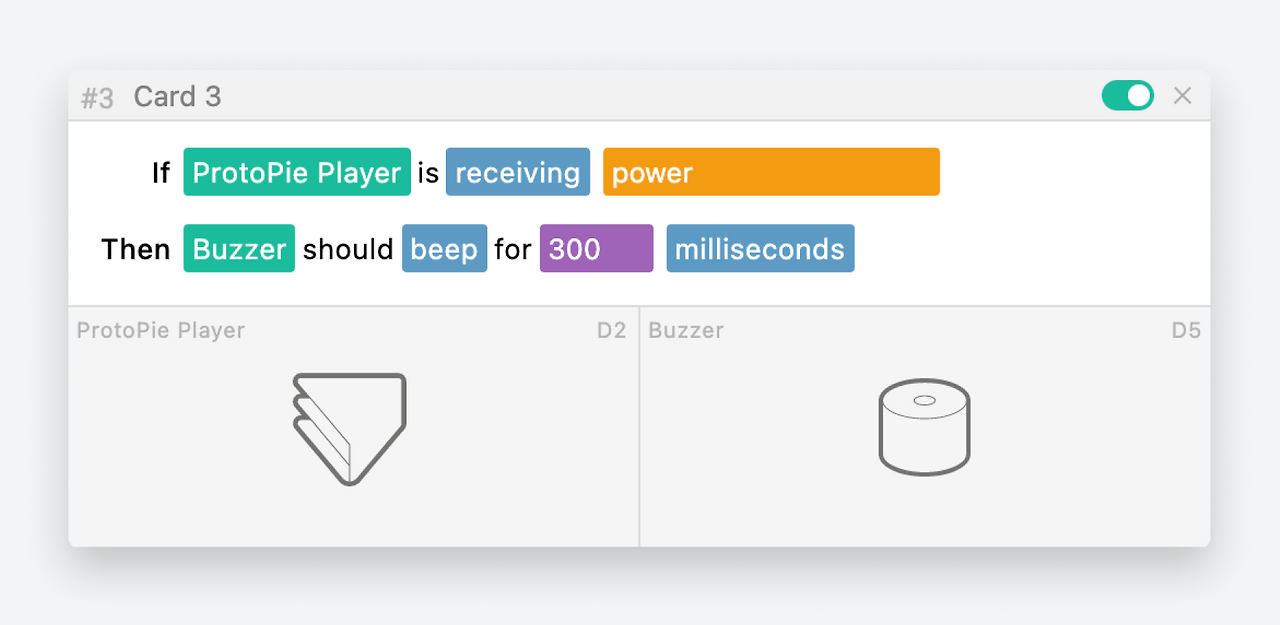 아래 예시 카드의 경우, blokdots가 ProtoPie로부터 “power”라는 메시지를 수신하면 버저 구성 요소가 300밀리초 동안 경고음을 울리도록 설정되어 있습니다.