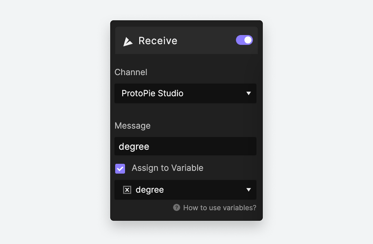 ProtoPie Studio에서 Receive Trigger와 Send Response은 장치 간의 통신을 시작합니다. 채널을 ProtoPie Studio로 설정하고 메시지를 원하는 대로 설정하기만 하면 됩니다.