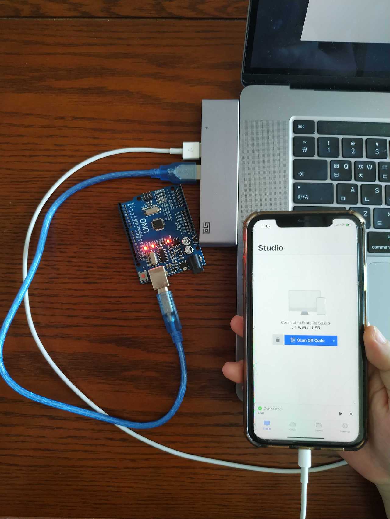 아래 예시에서 보이는 것처럼, ProtoPie Connect를 통해 소프트웨어 프로토타입이 아두이노 셋업과 신호를 주고받을 수 있습니다.