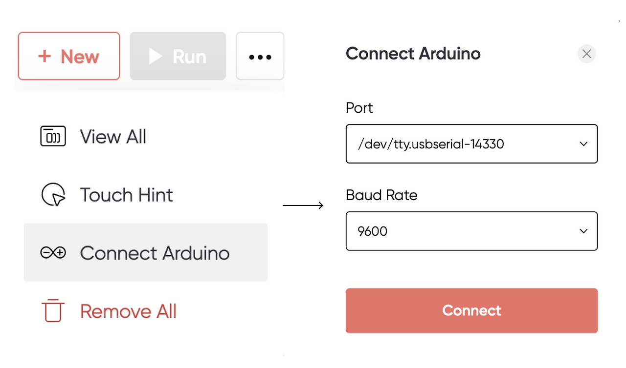 3. “...”를 클릭하여 아두이노를 ProtoPie Connect와 연결 후, Port와 Baud rate를 아래와 같이 선택하세요.