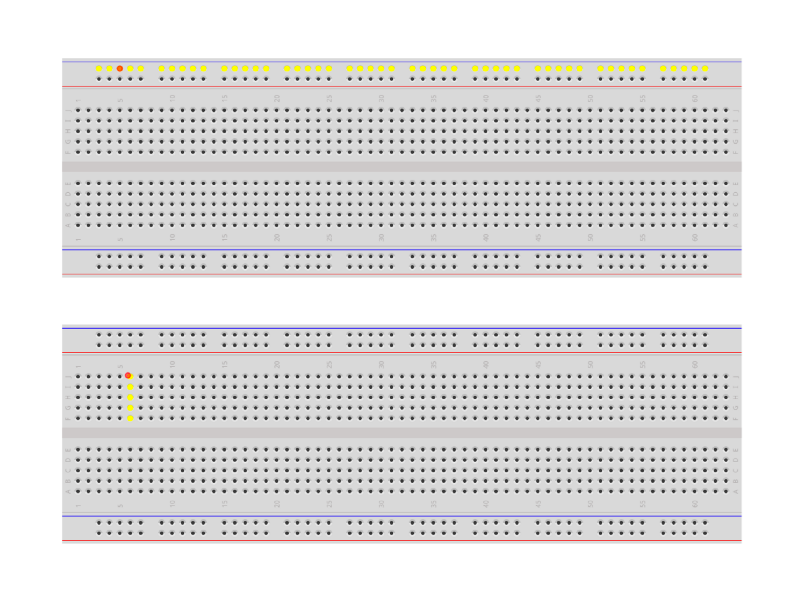 전자 부품을 조립하려면 기본적으로 핀홀이 많은 플라스틱 보드인 브레드보드가 필요합니다. 핀은 수직 및 수평으로 연결되므로, 회로를 만들기 위해 각 전자 부품을 종단 간 와이어링이 필요하지 않습니다.