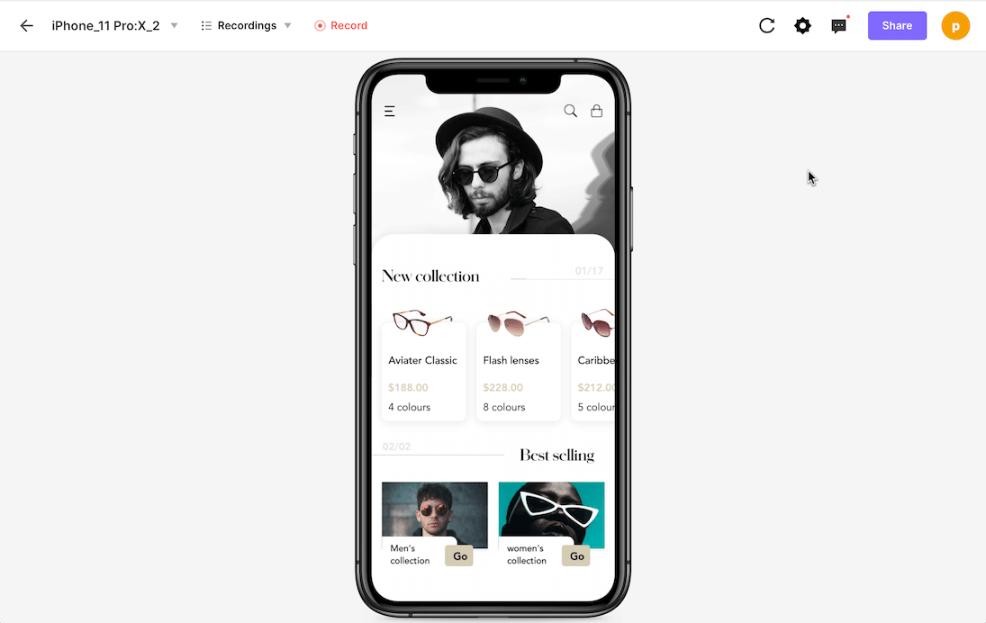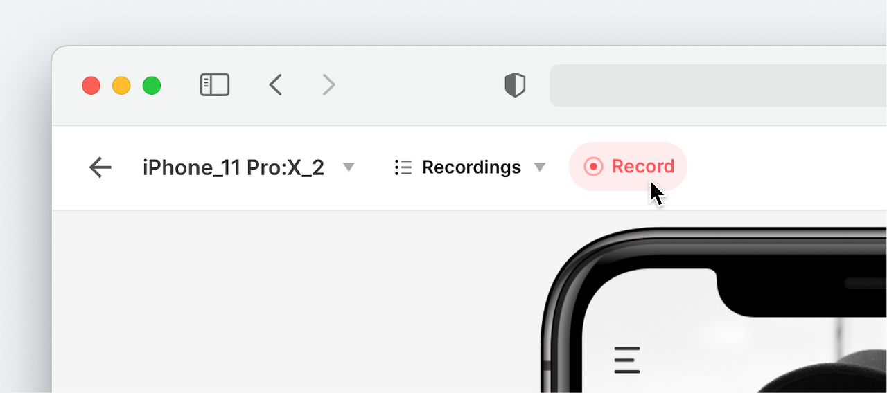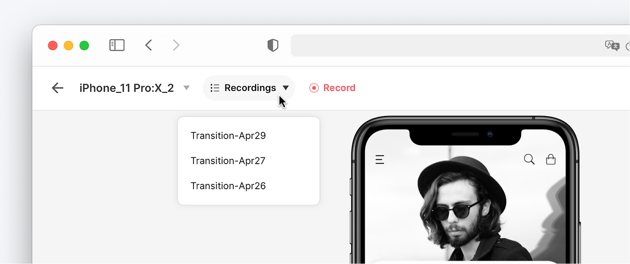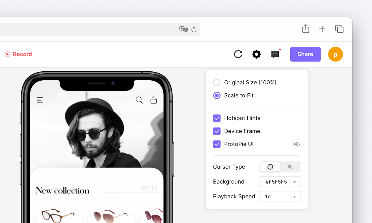ProtoPie Cloud에서 Pie를 볼 때, 브라우저 창의 왼쪽에서 Interaction Recording이라는 패널을 찾으세요.