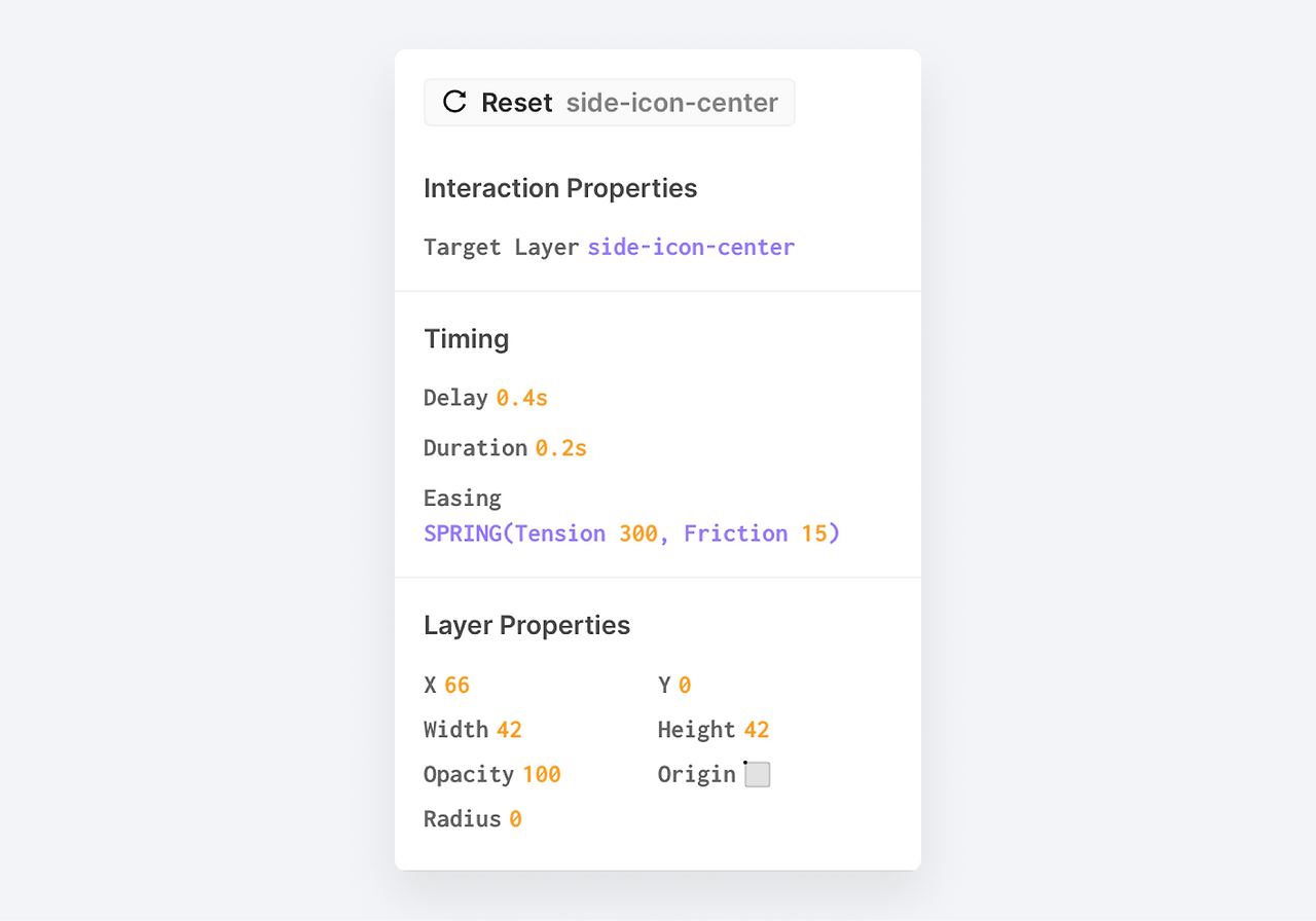 ▶ 특정 response의 애니메이션 검사: 타임라인에서 아무 Response나 클릭하면, 화면 오른쪽 상단에 검사기 창이 나타납니다. 여기에는 애니메이션의 시작점과 끝점에 있는 속성의 정확한 값, 애니메이션 곡선 완화 매개 변수 및 검사하는 특정 속성의 "현재" 값이 표시됩니다. 현재 값은 재생 헤드와 동기화되어 실시간으로 업데이트됩니다.