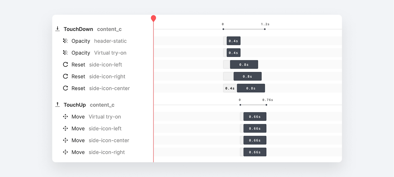 ▶ 애니메이션 스크럽: 빨간색 화살표(재생 헤드)를 오른쪽과 왼쪽으로 드래그합니다. 이렇게하면 방금 프레임 단위로 녹화된 인터랙션을 볼 수 있습니다.