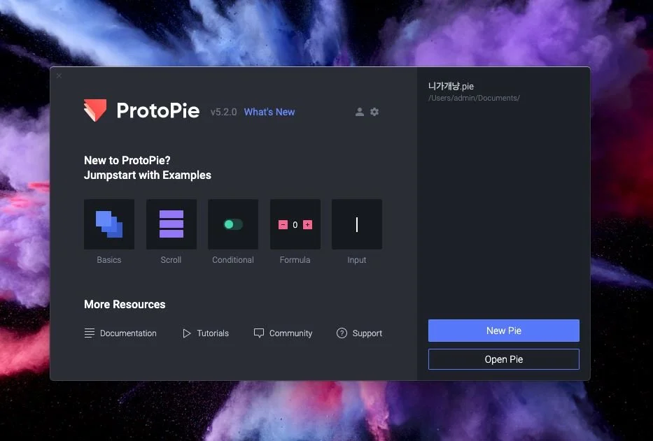 설치를 완료하면 컴퓨터에 ProtoPie 전용 프로그램이 생깁니다. 프로그램을 클릭하면 아래와 같은 화면을 만나게 됩니다.