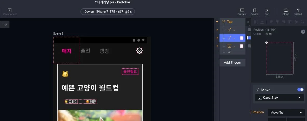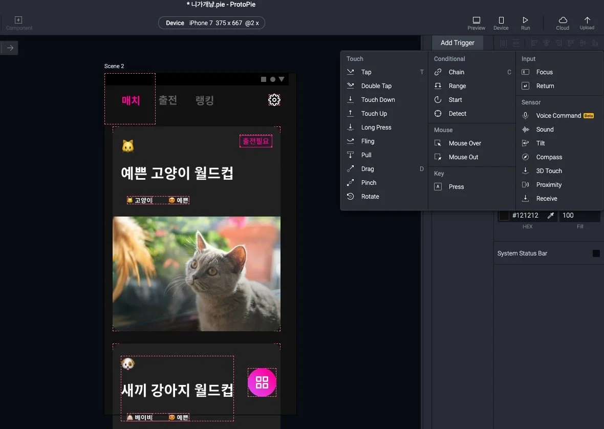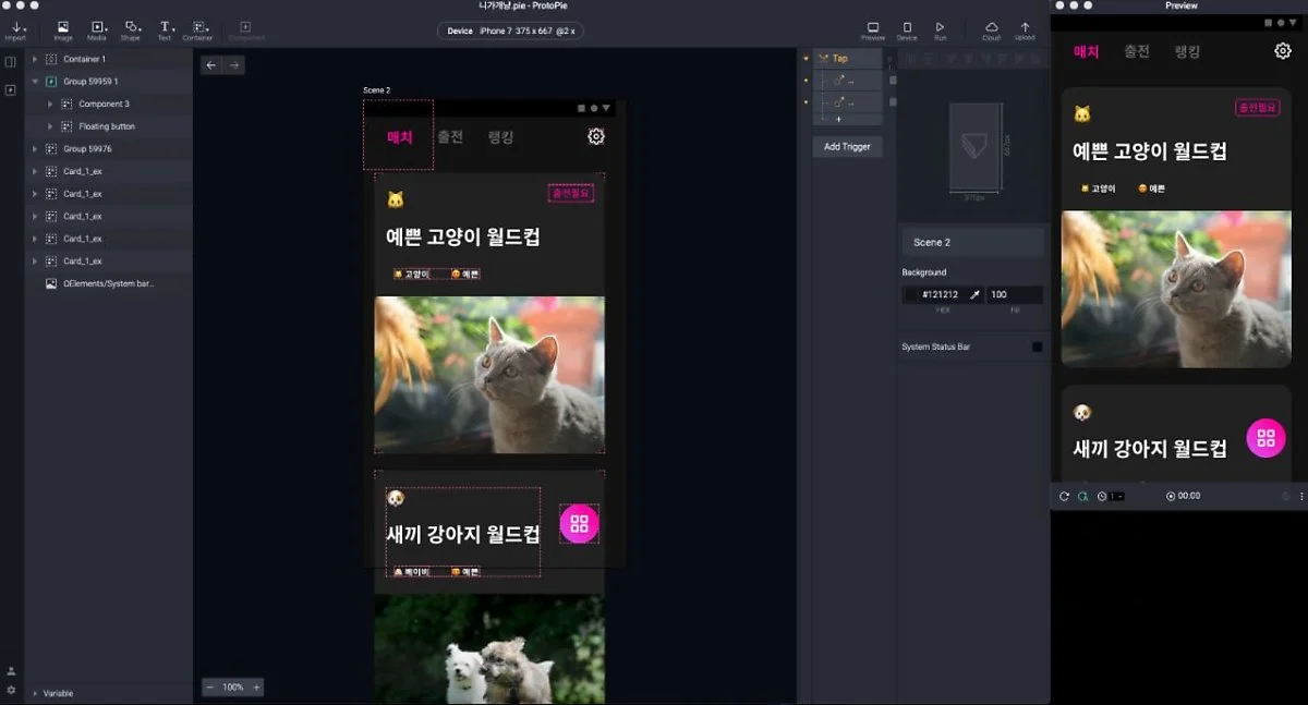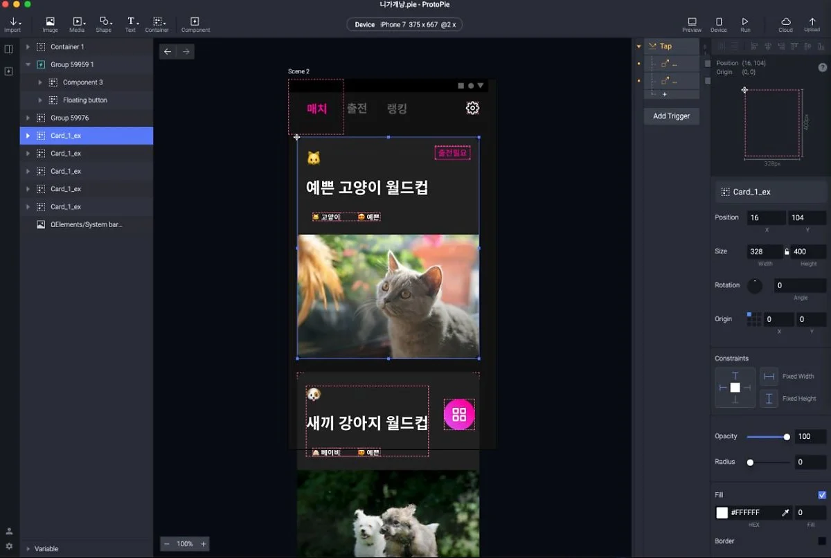 화면에서 <예쁜 고양이 월드컵>을 선택하니 오른쪽에 피그마와 비슷한 형식의 툴들이 보입니다. Position이 있고 Rotation과 Origin이 보이며, 아래로 Constraints와 Opacity, Radius, Fill, Border 등 UX 디자이너라면 쉽게 접했을 툴들이 차례로 보입니다. 여기까지는 일반적인 디자인 툴을 실행하는 것과 별반 다르지 않습니다.