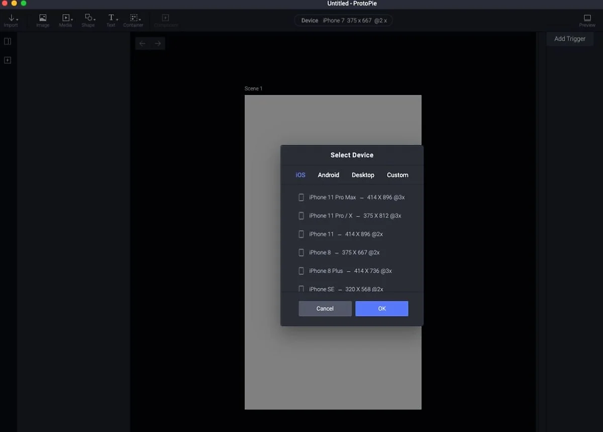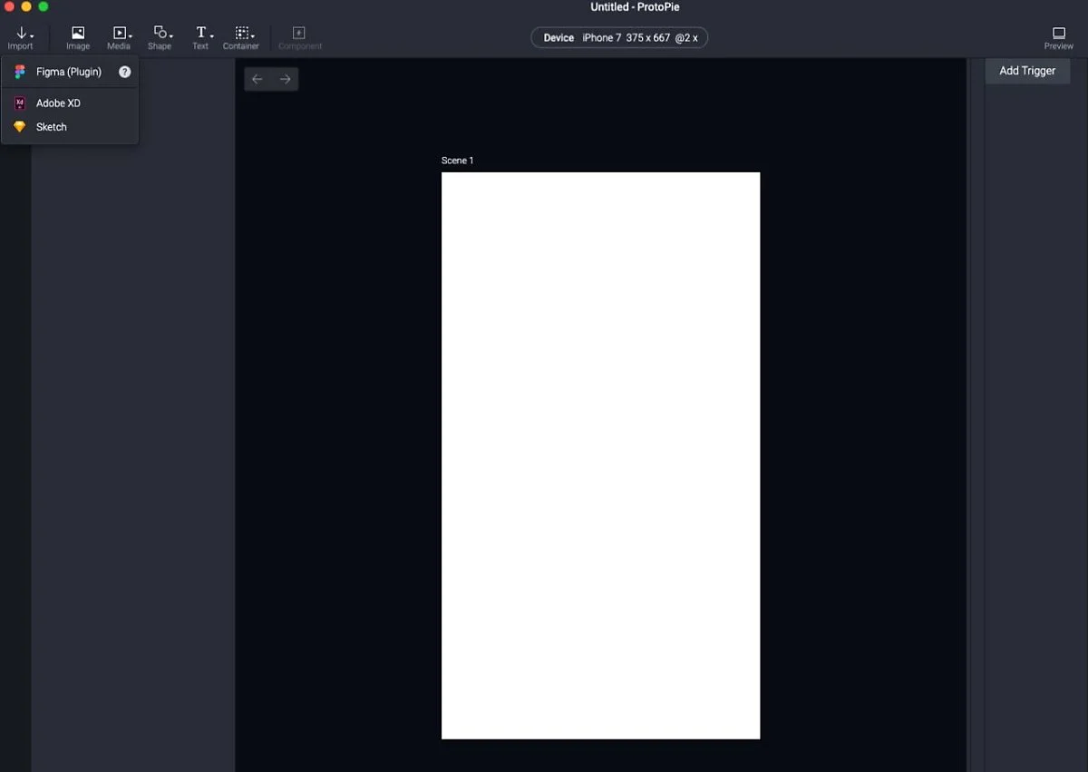 현재 ProtoPie는 Sketch와 Adobe XD, Figma에서 작업한 문서를 import 할 수 있습니다. 왼쪽 상단의 import를 클릭하면 확인할 수 있는데요.