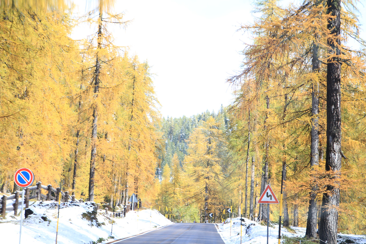 SS48번 도로 황금빛 이깔나무숲 사이로 난 길을 따라 차를 달리면 눈과 이깔나무의 숲이