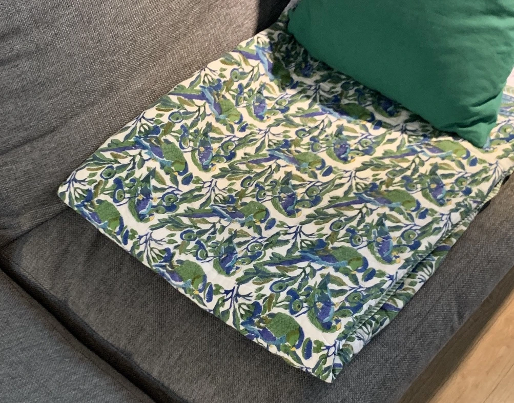 이 이불은 인도의 전통 핸드 블럭 프린팅 기술을 이용해 제작되는데, 나무 블럭에 무늬를 새기고 그 위에 천연염료를 묻힌 후 직물에 직접 도장처럼 찍어내는 방식이다. 그렇게 여러 도장의 조합을 반복해서 고르게 찍어내면 패턴이 완성된다. 삐뚤어진 모양을 발견한다면, 그때가 바로 이 이불의 규칙적인 듯 불규칙적인 매력을 발견하는 타이밍이다.