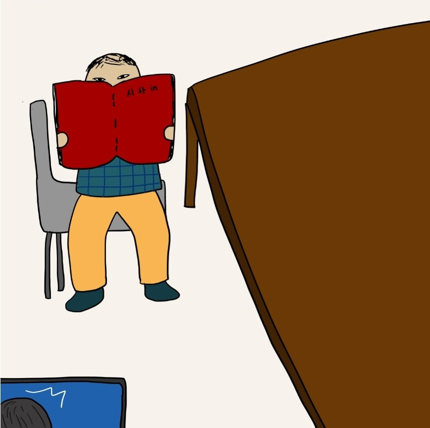 정기간행물로 얼굴을 가리면서 직원들을 훔쳐보는 이용자‘어? 웬 시선이 느껴지지? 이용자가 내 앞에 한 명도 안 와있는데? 이상하다?’