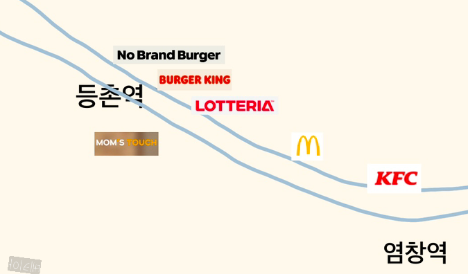 재미있는 건 한 길에 KFC, 맥도널드, 버거킹, 롯데리아, 노브랜드가 쪼르르 있다는 것이다.
