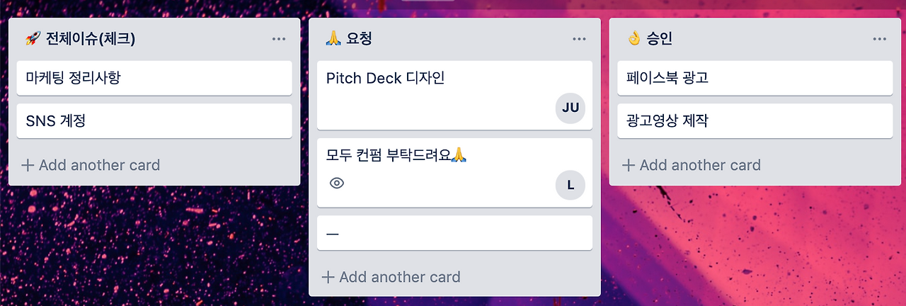 그래서 우리가 효율적으로 일하기 위해 쓰고 있는 툴이 크게 3가지가 있다. (물론 모두 개인적인 용도로도 쓸 수 있는 툴이다.) 이번 글에서는 트렐로를 다뤄보려 한다.